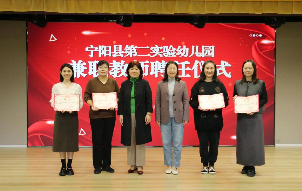 活动中,宁阳第二实验幼儿园聘请我院李南、杨柳、林艳艳、李玫倩四位老师为幼儿园兼职教师,李方园长为受聘教师颁发聘书。