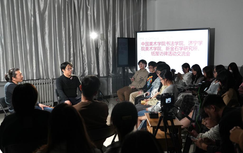 鲁大东与周松林展开对话,并与师生就金石学研究方法、摩崖书法与自然景观的关系、实物对于书法研究的价值、书法学习的方法等问题进行了深入探讨。他指出,学校坐落于文化圣地曲阜,境内碑碣林立,汉碑数量居全国之首,收藏着《礼器碑》《乙瑛碑》《史晨碑》《孔宙碑》《张猛龙碑》等在中国书法史上鼎鼎大名的碑刻,自古以来就是金石学家研究的重镇,对开展金石书法研究具有得天独厚的优势。并对美术学院师生进一步利用好这些宝贵资源,持续深入挖掘优秀传统文化和地域文化等方面提出了针对性意见建议。