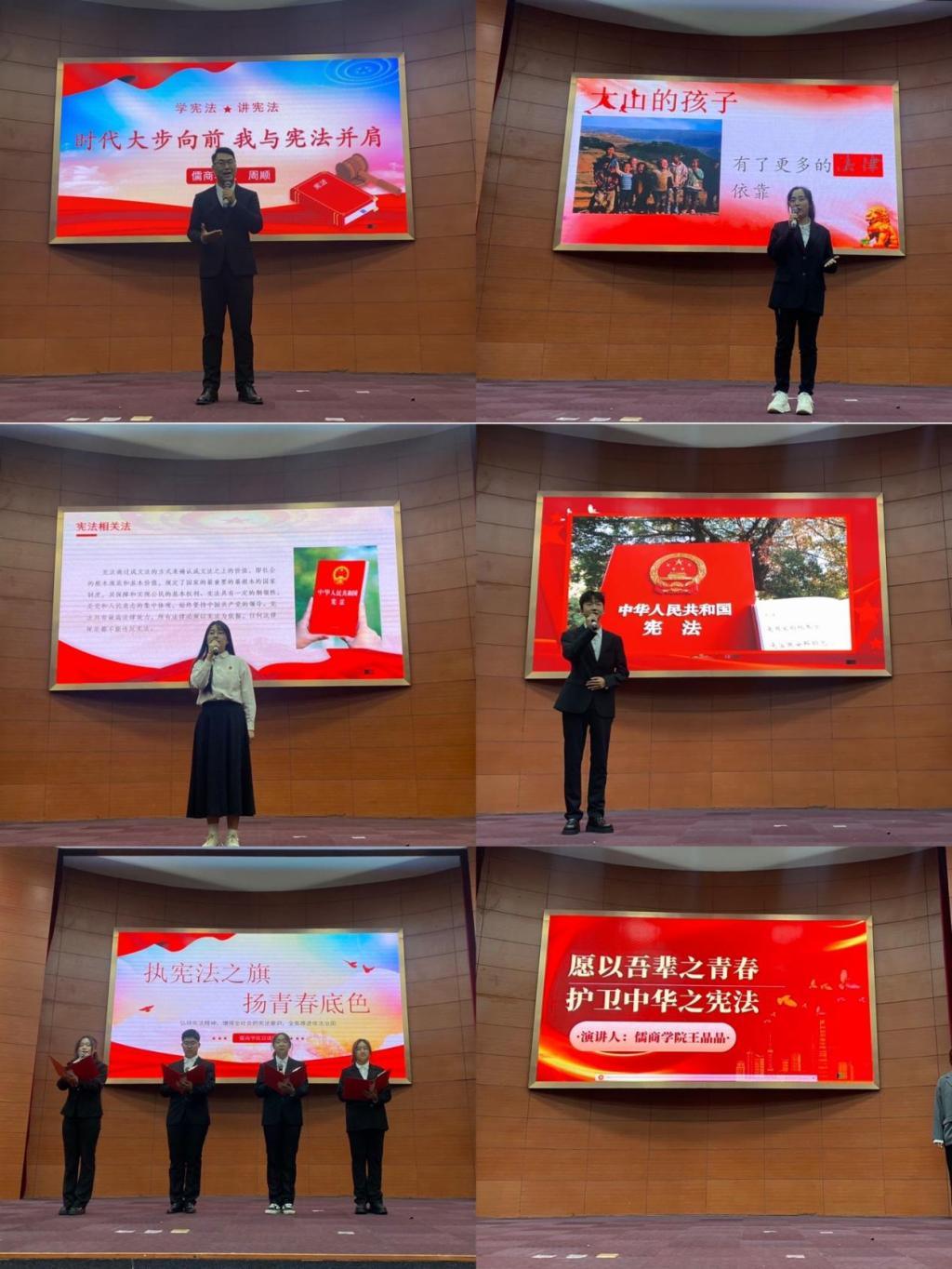 比赛中,12名参赛选手以“学宪法 讲宪法”为主题,从社会热点、案例故事、自身体会等方面切入,抒发自己爱党、爱国、爱社会主义的情感,讲述自己学习宪法法治知识、树立法治意识的心得体会,讲述自己对公平、正义、平等、诚信等原则的理解感悟,讲述自己从事法治实践、弘扬社会主义法治精神的真实故事。经过激烈角逐,儒商学院周顺、韩天依同学荣获一等奖。参赛选手们精彩的演讲赢得了评委和观众的阵阵掌声。