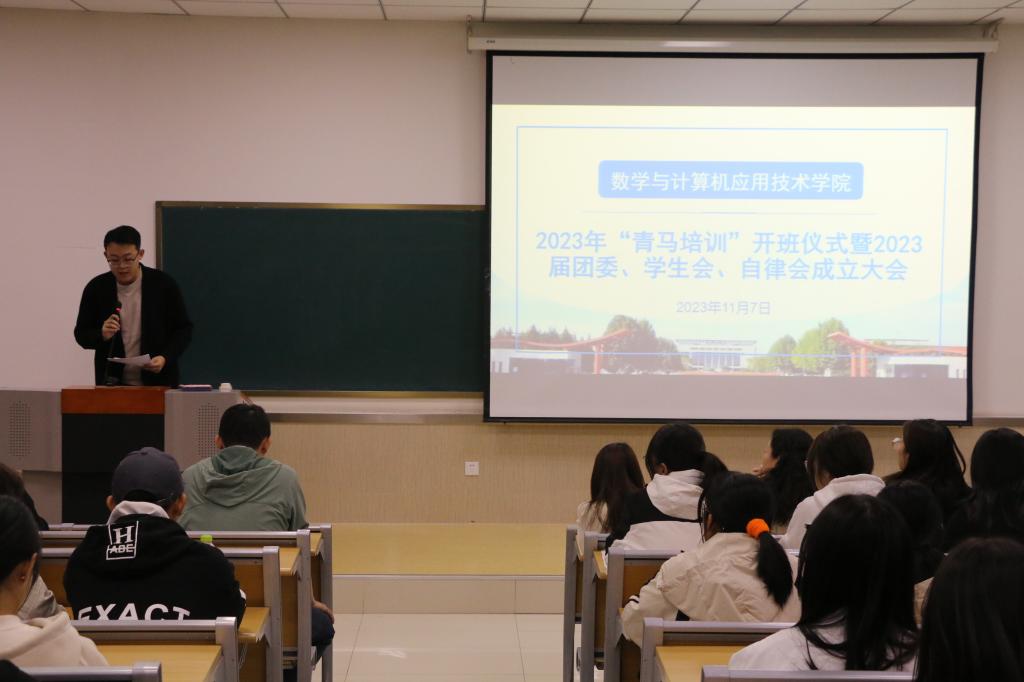 11月7日下午,数学与计算机应用技术学院在8B203教室召开2023年“青马计划”开班仪式暨2023届团委、学生会、自律会成立大会。辅导员王都主持。学院党委副书记冯秉政,团委副书记陈轶洋,及全体辅导员出席。2023届数计学院团委、学生会、自律会全体成员参加。