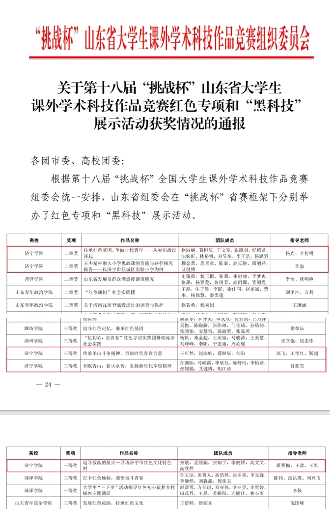 本次比赛中,由杨光、李传明老师指导,赵淑娴、葛桓辰等同学完成的《传承红色基因,争做时代青年——从兖州战役谈起》,由李盎老师指导,穆金蕾、周景童等同学完成的《王杰精神融入小学思政课的价值与路径探究报告——以济宁市任城区实验小学为例》获省赛二等奖;由高飞、王艳红、靳超老师指导,王可然、赵淑娴等同学完成的《传承羊山斗争精神,贡献时代青春力量》,由付茹雪老师指导,孙潇眙、马岷溪等同学完成的《长眠青山,薪火永传——弘扬新时代辛锐精神》,蔡秀梅、王款、王凯老师指导,张敏、孟丽娟等同学完成的《追寻散落的星火—寻访济宁市红色文化特色村》获省赛三等奖。