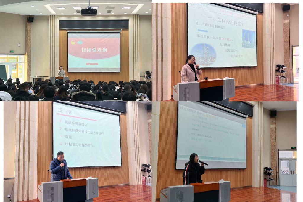李文婷为同学们解读了创业就业普惠政策,以及大学生创新创业和学科竞赛相关知识,带领大家学习了《化学化工与材料学院创新创业与学科竞赛指引目录》和亚星在线登录官网大学生创新创业类教育全年系列活动安排,并展示学院2023年大学生创新创业和学科竞赛成果,让同学们对创新创业政策和各类竞赛有了更深入的了解。李继森从“挑战杯”竞赛简介、挑战杯课外科技作品大赛流程、选题、申报书与附件的写作几个方面对同学们做了详细指导,并提出大学期间要积极参与科学研究和论文发表的建议,对同学们日后的就业、升学具有很大帮助。张春仙老师从大学目标定位、全国大学生化工设计竞赛介绍、备赛收获等方面入手,鼓励同学们积极参加科学研究和学科竞赛,在竞赛中提升创新意识和创新能力,并给同学们播放了历届获奖学生寄语视频,同学们积极响应,纷纷加入交流群。杨慧芝为同学们分享了“互联网+”大学生创新创业大赛的开展时间、模式和要求,讲解了参与竞赛的重要意义和所需条件,勉励同学们积极参加创新创业竞赛,为学业深造、未来职业发展打下坚实基础。