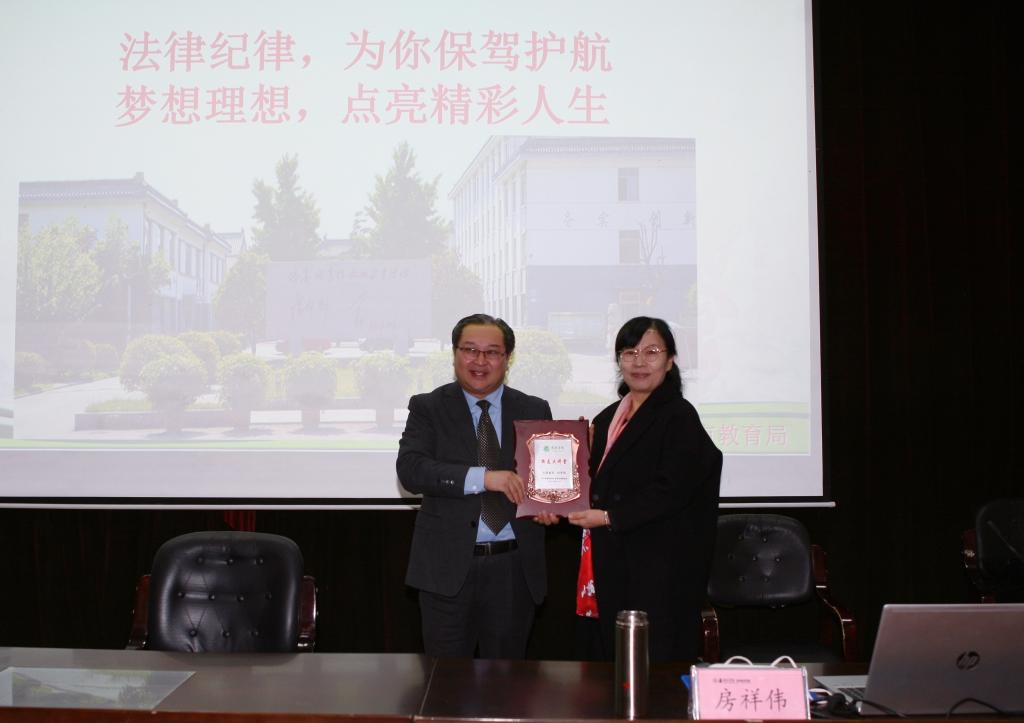 刘秋香为校友房祥伟颁赠了“校友大讲堂”纪念铭牌,并对房祥伟回母校为同学们作报告表示欢迎和感谢。