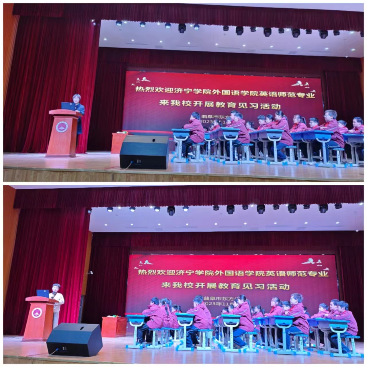为加强师范生对基础教育现状的了解,11月23日下午,外国语学院师生在学术副院长闫彩霞、范莉的带领下到曲阜市东方学校开展教育见习活动。专业负责人吴瑞民、教研室主任邵敏,见习指导老师、辅导员老师以及包括2021级、2023级和2023专升本在内的300多名师范生参加了本次活动。