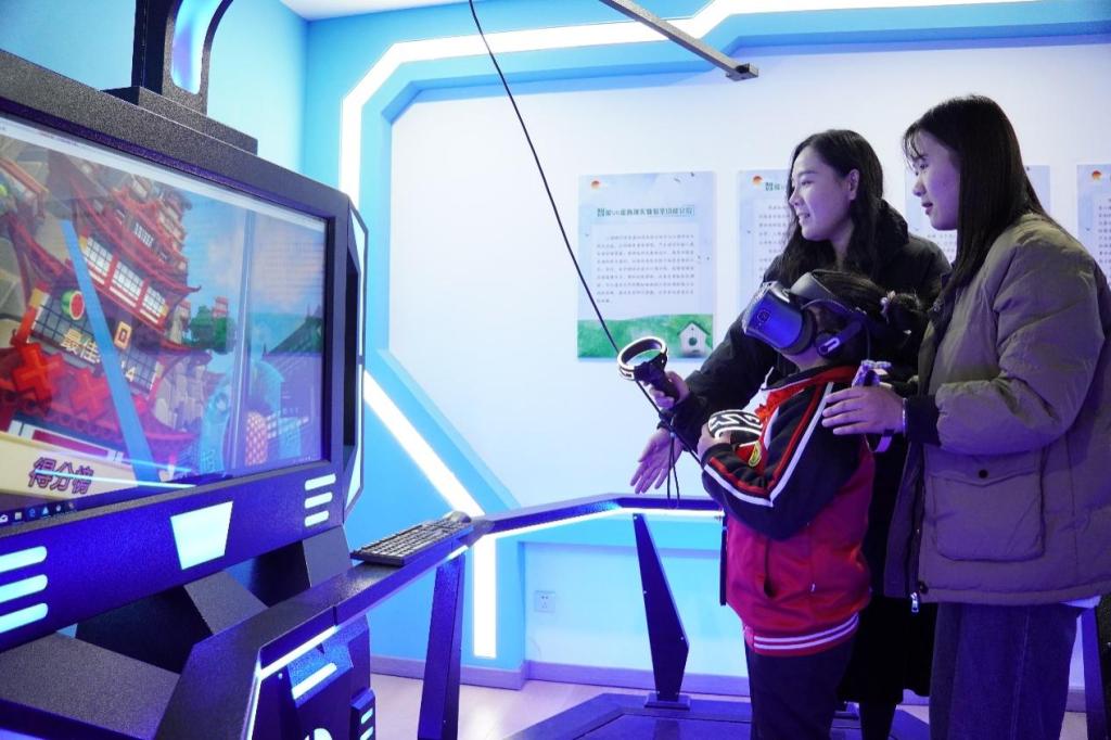 孩子们随后前往心理健康中心进行参观,体验到精彩的沙盘游戏,用沙盘室里的各种道具构造出他们心中的世界。孩子们戴上眼镜设备,亲身参与屏幕中的活动场景,VR虚拟技术拓宽了他们的视野,带来视觉盛宴。VR培训室里不时传来阵阵欢笑,孩子们感受到数字化时代的魅力。