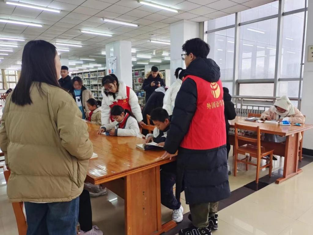 上午九点,志愿者们在学校西门等待孩子们的到来,孩子们进入校园后,由我院大学生志愿者们带领孩子们进入图书馆二楼进行参观,志愿者们对图书馆的历史与藏书进行了介绍,激起了孩子们学习的浓厚兴趣。