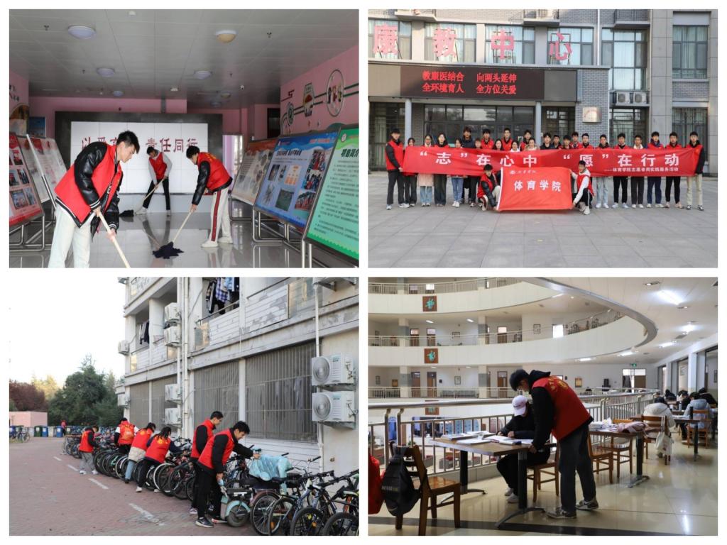 体育学院志愿者开展特殊学校志愿服务、宿舍周边车辆整顿、图书馆服务同学等志愿服务活动。