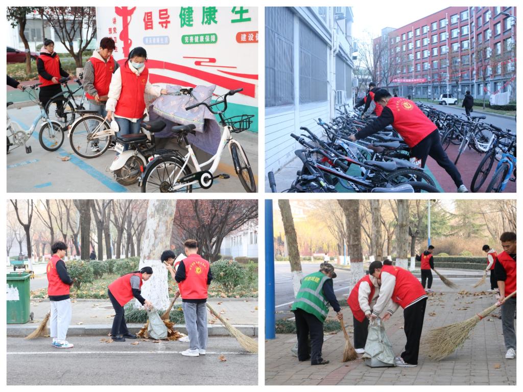 志愿者们协助环卫工人在校园内大大小小的街道上进行了“落叶大清扫”,为创建美丽校园贡献出一份力量;志愿者们对校内共享单车和私有单车进行摆放整理归类,不论是生活区还是教学区都井然有序,在校园内形成了一道优美的风景线。
