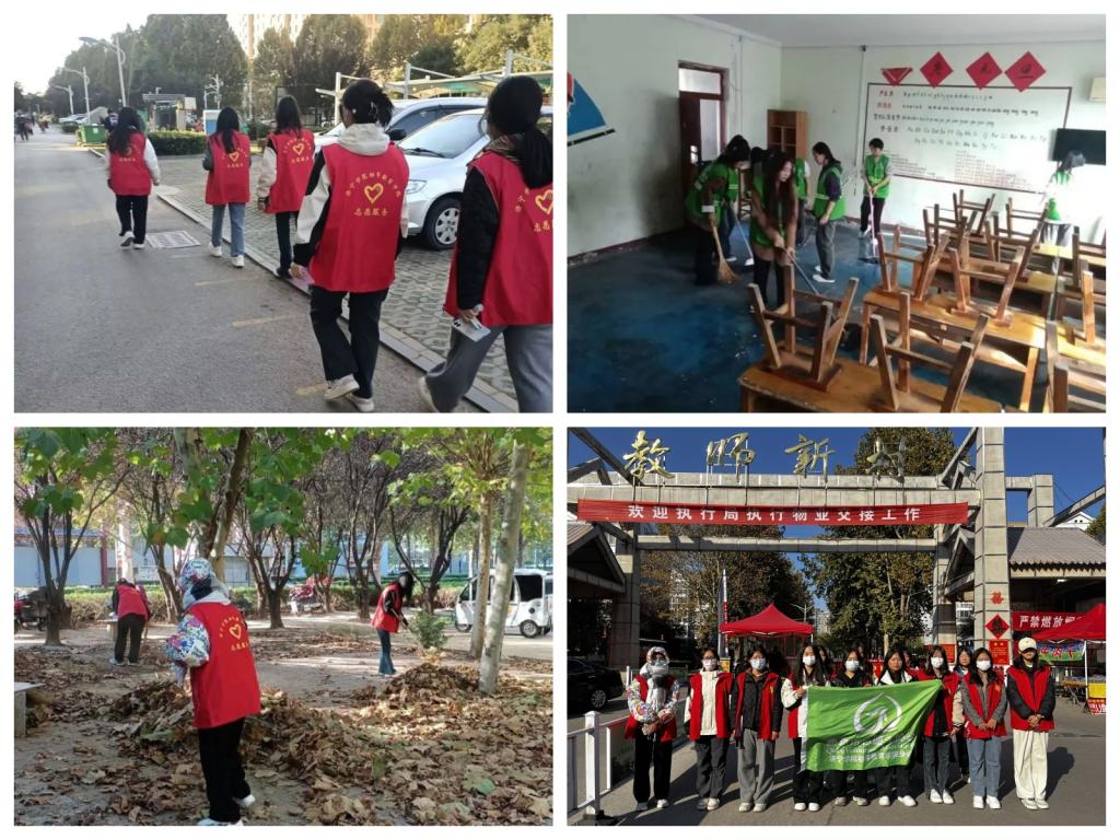 在圣德书院,志愿者们以细心和耐心的态度对待这群特殊儿童,同时,志愿者们还主动打扫卫生,陪他们唱歌、跳舞、讲故事、做游戏,为这群小可爱送去最真诚的爱意,传递世界的温暖,让爱留在心间。在教师新村,志愿者身穿红色马甲,开展清扫树叶、社区走访活动,美化社区环境,营造良好氛围。