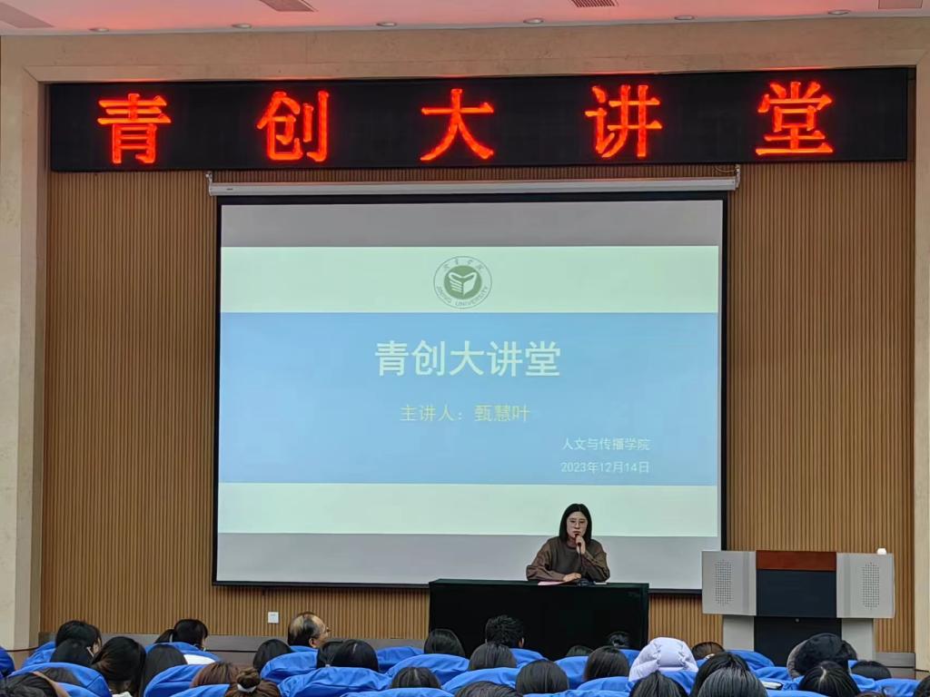 近日,人文与传播学院在三号楼报告厅举办“青创大讲堂”创业报告会。我校2022届汉语言文学专业学生甄慧叶应人文与传播学院邀请到场作报告。报告采用线上线下相结合方式,师生共计1000余人参加报告会。该院党委书记朱桂林、副书记岳现超、全体辅导员出席活动,报告会由该院团委副书记张甜主持。