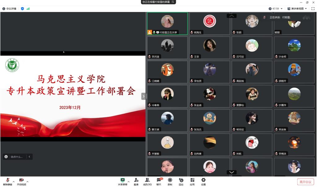 为全力做好2024年普通高等学校专升本考生服务工作,马克思主义学院于12月20日通过腾讯会议召开专升本政策解读暨工作部署会,该院副院长沙世蕤、教学科研办公室主任许雁萍、团委书记姚海生和2021级小学道德与法治教育全体学生参会,会议由毕业班辅导员付茹雪主持。