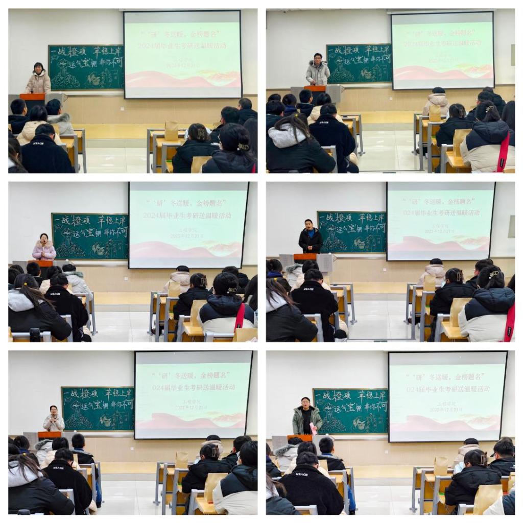 党委书记唐秋晶肯定了考研学子的努力,提醒同学们要注意劳逸结合,保持良好的身体和学习状态迎接考试,祝福同学们取得好成绩,实现继续升学的目标和愿望;各教研室主任、班主任结合自身考研经历,提醒同学们要注意考研时间、做好考前准备和考试细节,并鼓励大家在这关键时间要稳住心态,不急不躁;2024届考研学生代表吕丰泰表示会抓住机会、迎难而上,努力实现考研梦想,以优异的成绩回报学院的栽培和老师们的关心鼓励。
