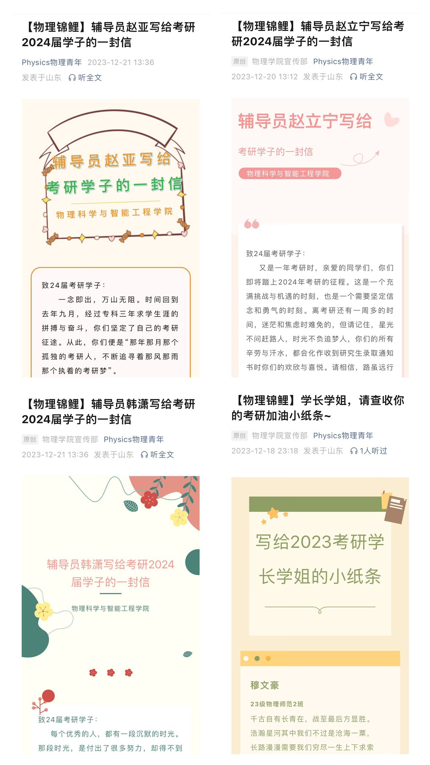 寒冬送暖,研途相伴。物理科学与智能工程学院采用线上线下相结合的方式为考研学子送祝福,利用微信公众“物理锦鲤”合集展播“辅导员写给考研学子的一封信”和“考研加油小纸条”。