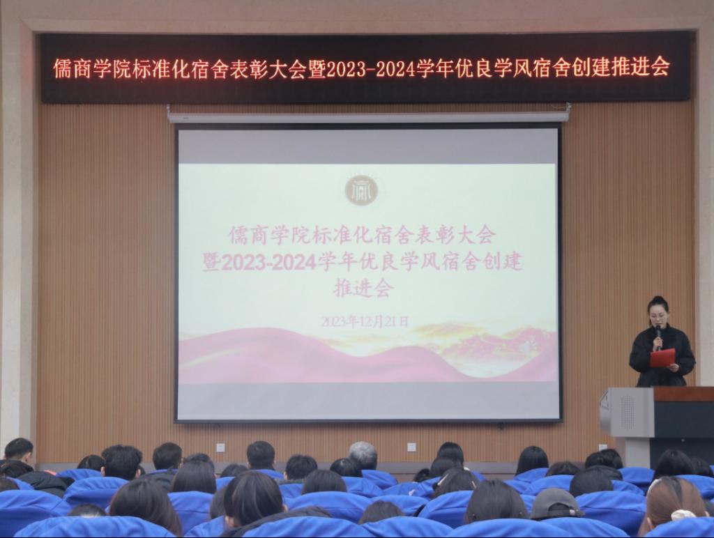 为充分发挥宿舍建设在学生成长成才中的凝聚、引导、服务作用,提升学生“自我教育、自我管理、自我服务”的意识,真正把学生宿舍建设成为学生生活、学习、文化、社交、锻炼、育人的温馨小家、励志之地和远航的港湾。12月21日下午,儒商学院在3号楼报告厅举办了标准化宿舍创建活动表彰大会暨2023-2024学年优良学风宿舍创建推进会,学院党委书记乔东华、党委副书记孔国良、团委书记袁芬、全体辅导及180余位学生宿舍代表参加本次大会,大会由辅导员陈梦园主持。