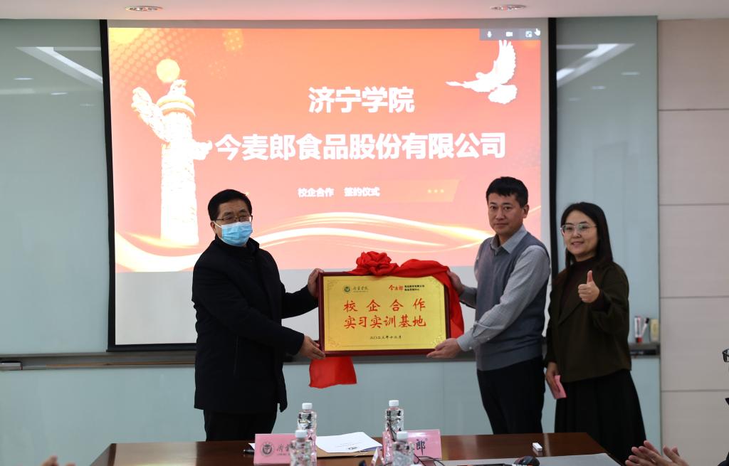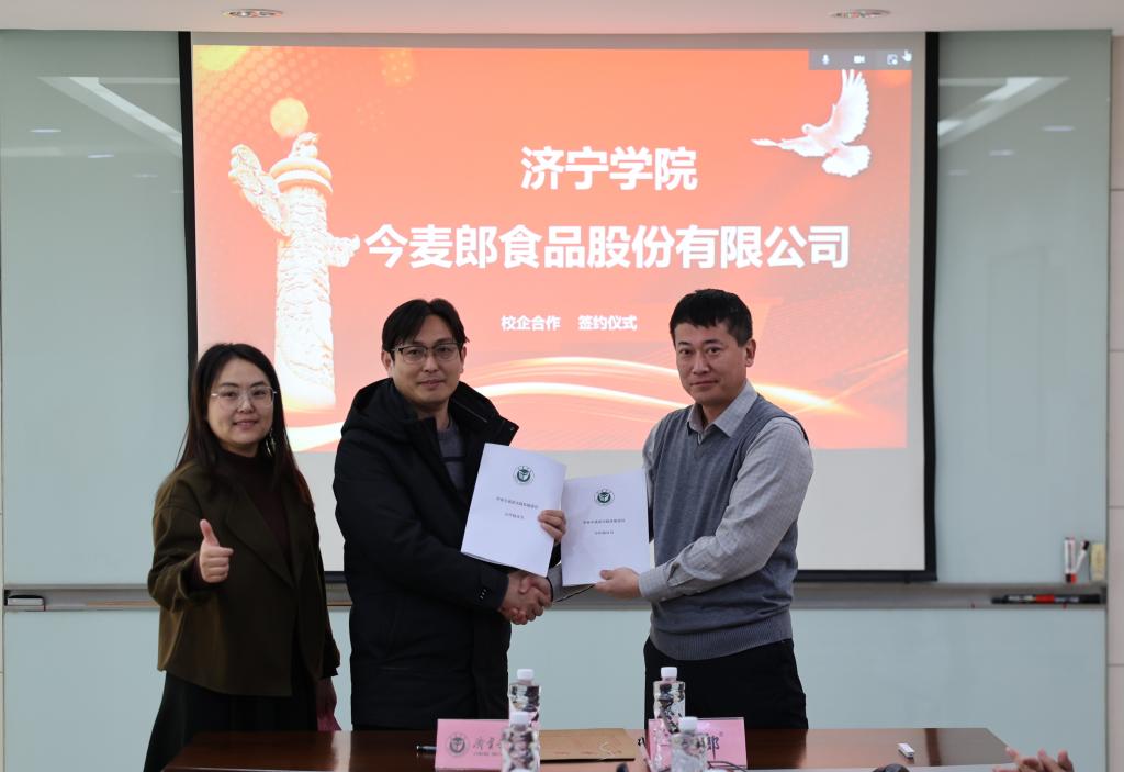 亚星在线登录官网学生工作处副处长蒿鹏和游学兵签署《亚星在线登录官网—今麦郎面品(兖州)有限公司毕业生就业实践基地建设合作协议书》。