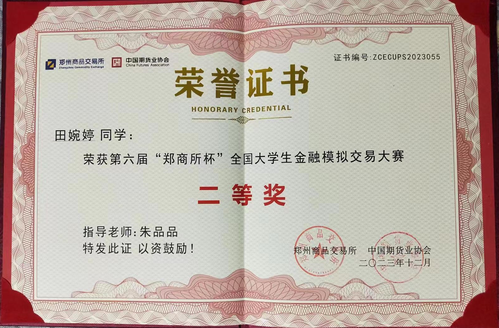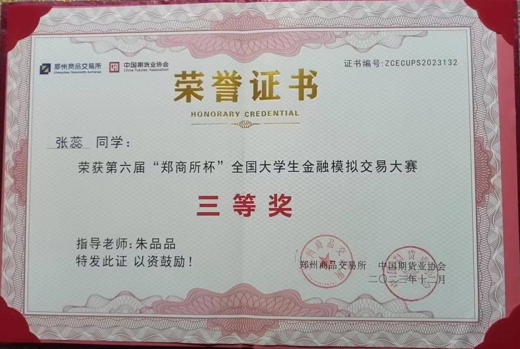 日前,由中国证监会期货部、中国证监会投保局及中国证监会团委指导,郑州商品交易所、中国期货业协会主办,期货日报社承办的第六届“郑商所杯”全国大学生金融模拟交易大赛落下帷幕,儒商学院学生在本次比赛中取得了优异成绩,其中田婉婷同学获得全国二等奖、张蕊同学获得全国三等奖(指导教师:朱品品),刘浩冉、帅佳仪两位同学获得比赛优胜奖,另有9位同学获得鼓励奖,学校被授予“优秀合作高校”奖。