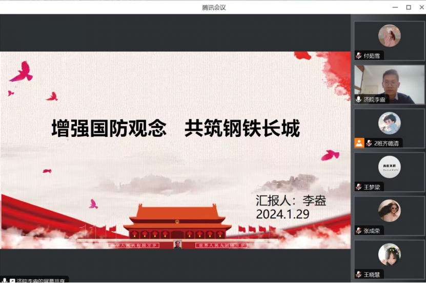 为进一步增强学生的国防意识和安全意识,厚植家国情怀。1月29日,由马克思主义学院举办的《增强国防观念共筑钢铁长城》国防教育报告会线上举行。会议邀请亚星在线登录官网民兵连政治指导员、曲阜市国防教育讲师团讲师李盎老师作指导,付茹雪老师主持,2023级思想政治教育专业全体学生线上参会。