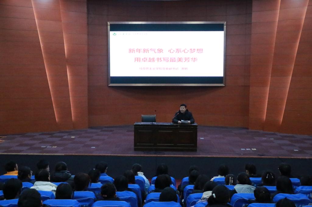 为切实做好开学初学生教育管理服务工作,鼓励同学们以更加饱满的热情、崭新的面貌开启“热辣滚烫”的新学期,2月28日,马克思主义学院在理科楼报告厅召开了新学期“开学第一课”,对新学期相关学生工作进行安排部署。该学院副院长沙世蕤,党委副书记郝鹏,全体辅导员以及在校学生参加。