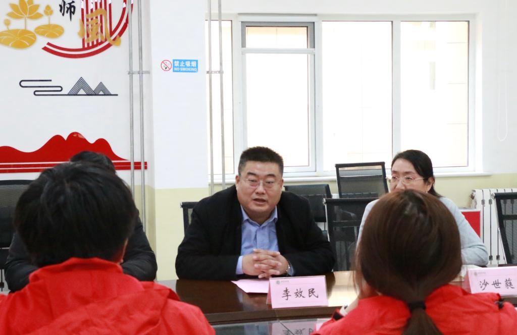 李效民代表学院党委向即将奔赴新疆支教的学生提出了五点希望和要求:一是要坚定信心,勇敢担负光荣使命;二是要注重学习,不断提高自身素质;三是要讲究方法,认真履行好工作职责;四是要严守纪律,自觉维护良好形象;五是要加强团结,共同创造新的辉煌。希望同学们在艰苦环境中锤炼党性、磨练意志、砥砺品格,努力适应新的环境和岗位,团结一致完成实习支教任务。
