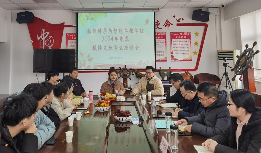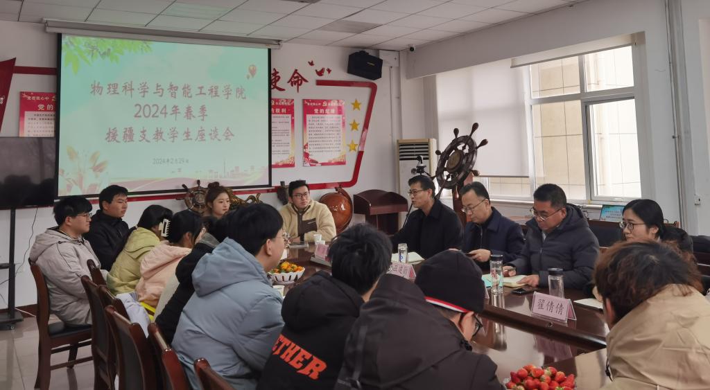 2月29日上午,物理科学与智能工程学院在学院二楼会议室举行援疆支教学生座谈会,党委书记卫建勋、副院长岳现房、党委副书记李洪波、副院长翟倩倩和辅导员韩潇、郝晓琳以及12名2021级援疆支教实习生和2020级援疆支教学生代表参加座谈会,座谈会由李洪波主持。