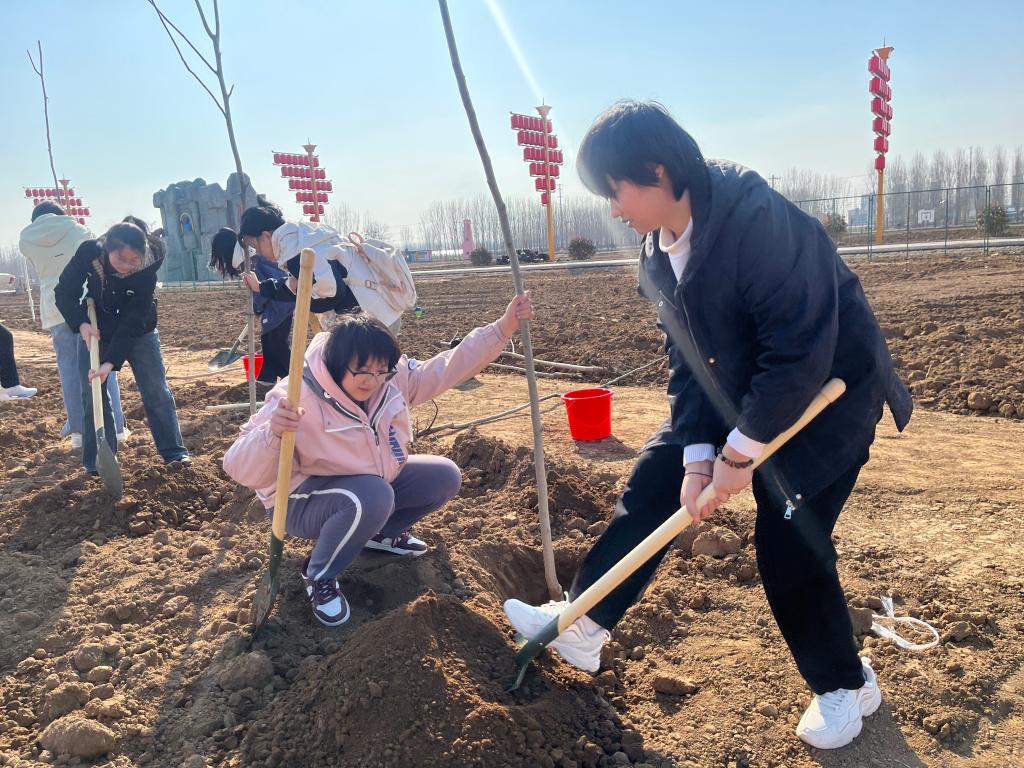马克思主义学院学子扛起锄头,挑起水桶,带好精心挑选的树苗,在当地工作人员的现场教学下,学习如何种植、浇灌好一棵树苗。同学们在认真学习之后很快投入劳动实践,干劲十足,散苗扶苗、挥锹铲土、挖坑栽树、盖土浇水,在大家的共同努力下,新植的一排排树苗迎风挺立,为田园增添了无限的生机和活力。