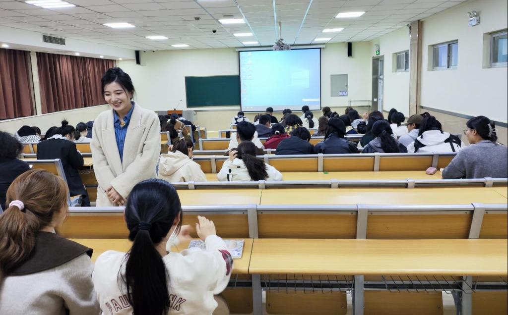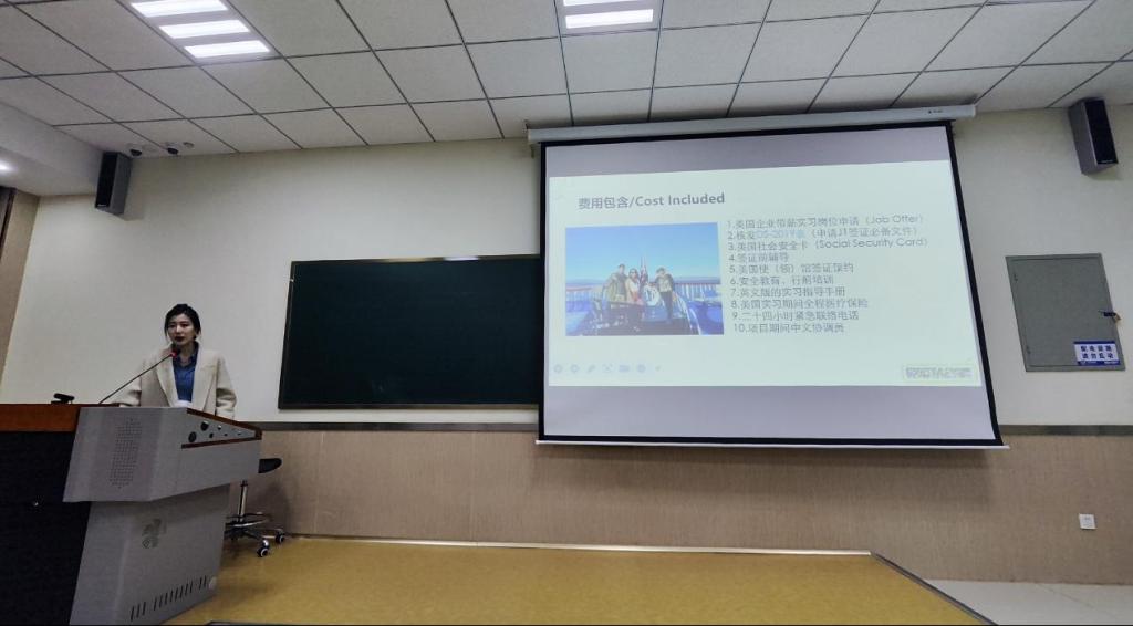 在宣讲中,2024年暑期赴美带薪实习项目负责人韩瑾凤通过PPT展示以及视频播放形式,对赴美带薪实习的优势进行了全面分析,她一一介绍了“赴美实践”的目的、学生收获、岗位类型、住宿条件、薪资待遇、申请报名的流程以及各项目具体收费等方面的信息,并就该项目的合法性、安全性做出详细介绍,她鼓励同学们走出国门,放眼世界,通过出国丰富自己的人生阅历,成为一个全面发展的大学生。在答疑交流环节,韩瑾凤针对同学们比较关心的对语言要求、面试流程、签证办理等问题进行详细解答并分享了自己之前赴美实习的有趣经历,宣讲会现场气氛活跃,同学们收获颇多。