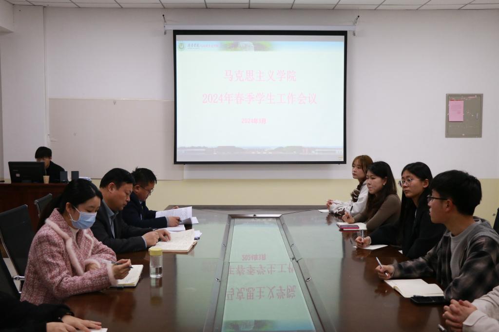 为进一步推进学风班风建设工作,加强班级管理和学生干部队伍建设,充分调动学生干部的工作积极性和主动性,3月14日晚,马克思主义学院在会议室召开了春季学期学生工作会议。学院党委副书记郝鹏出席会议并讲话,学院团委(学生科)书记(科长)姚海生、副书记(副科长)付茹雪,以及2022级、2023级全体班团干部,学院团委学生会成员参加会议。姚海生主持会议。