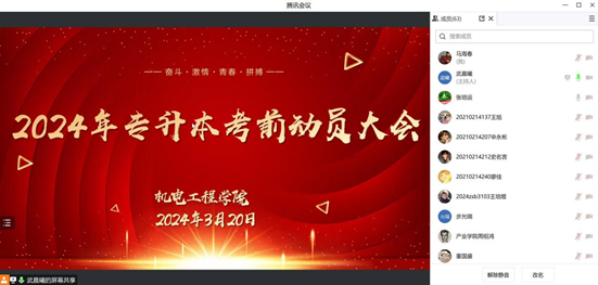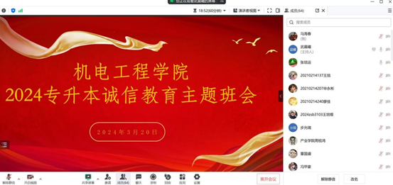 为做好专升本学生考前相关工作,进一步端正考风、严肃考纪,引导考生树立诚信考试的正确价值观,同时激励大家以更积极、更饱满的精神状态应考。3月20日,机电工程学院召开专升本考试诚信教育主题班会,进行了考前动员。学院党委副书记张培运、班主任夏海燕到会指导,2021级电气自动化技术全体考生参会。辅导员武晨曦主持会议。