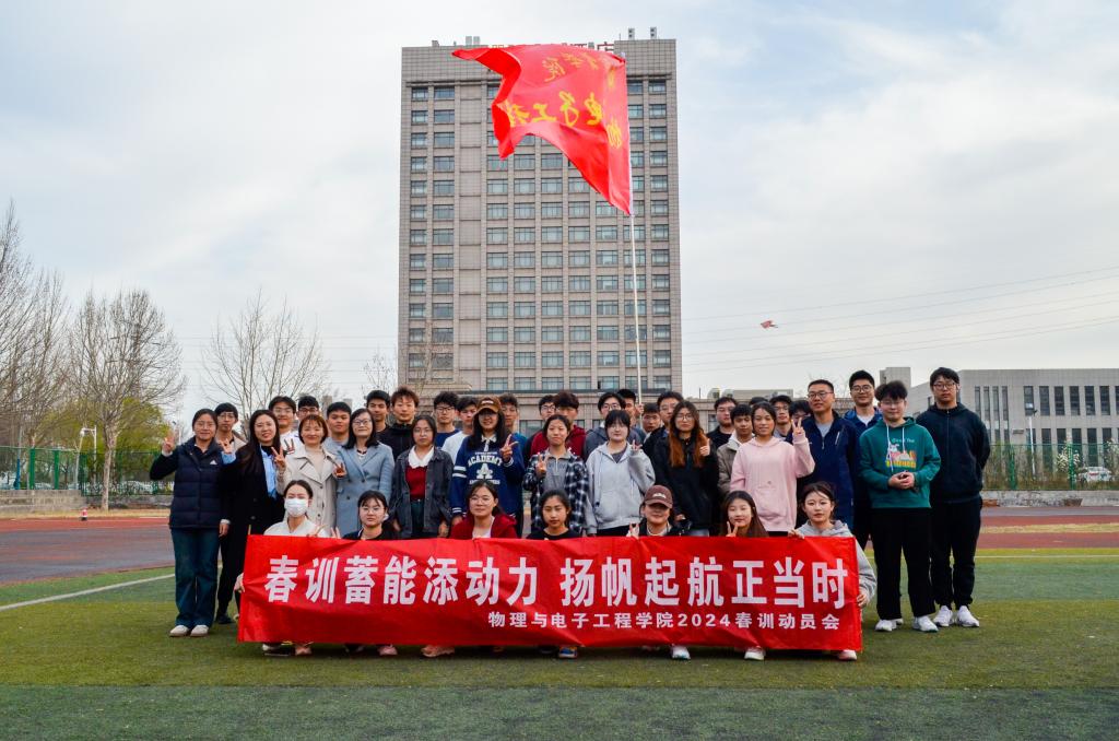 为树立学生积极锻炼意识,增强体育素养,3月21日下午,物理与电子工程学院于西操场召开以“春训蓄能添动力,扬帆起航正当时”为主题的春季训练动员会。物理与电子工程学院团委书记赵杨洋、全体辅导员以及学院全体训练队队员共40余人参加本次动员会。