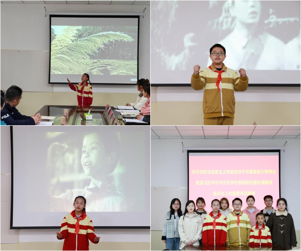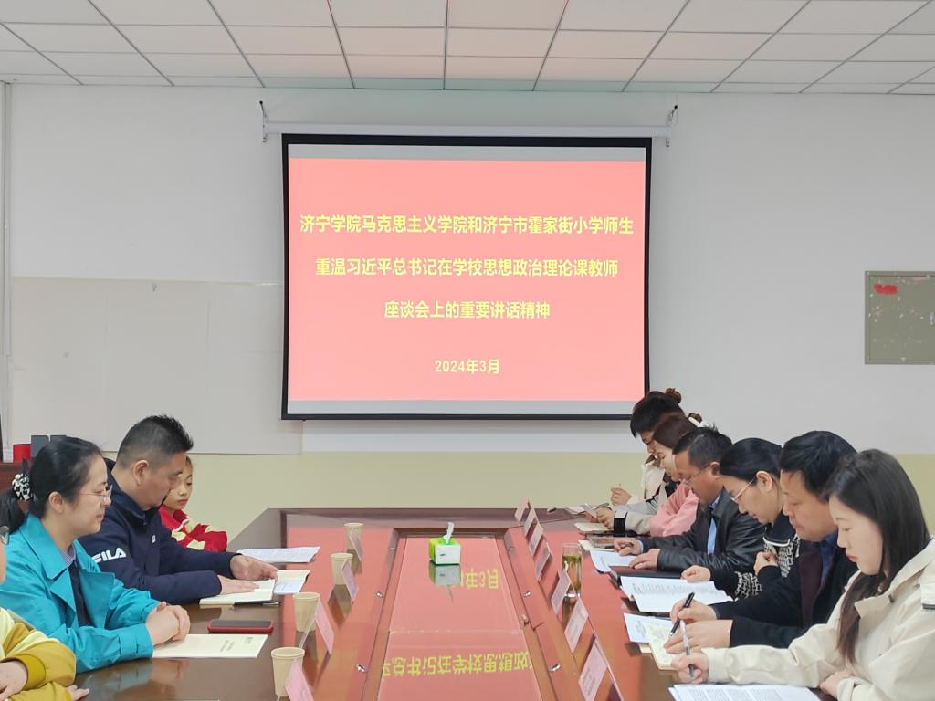 为了落实立德树人根本任务,重温习近平总书记在学校思想政治理论课教师座谈会上的重要讲话精神,扎实推进大中小学思想政治教育一体化建设,3月23日,马克思主义学院在会议室举行了“重温“3·18”重要讲话精神-学生论坛”活动。济宁市霍家街小学教育集团教务处主任蔡芳芳、副主任江兵,马克思主义学院副院长沙世蕤,党委副书记郝鹏出席活动,济宁市霍家街小学学生代表以及马克思主义学院的党员、入党积极分子和主要班干部代表参加活动。活动由马克思主义学院团委(学生科)书记(科长)姚海生主持。