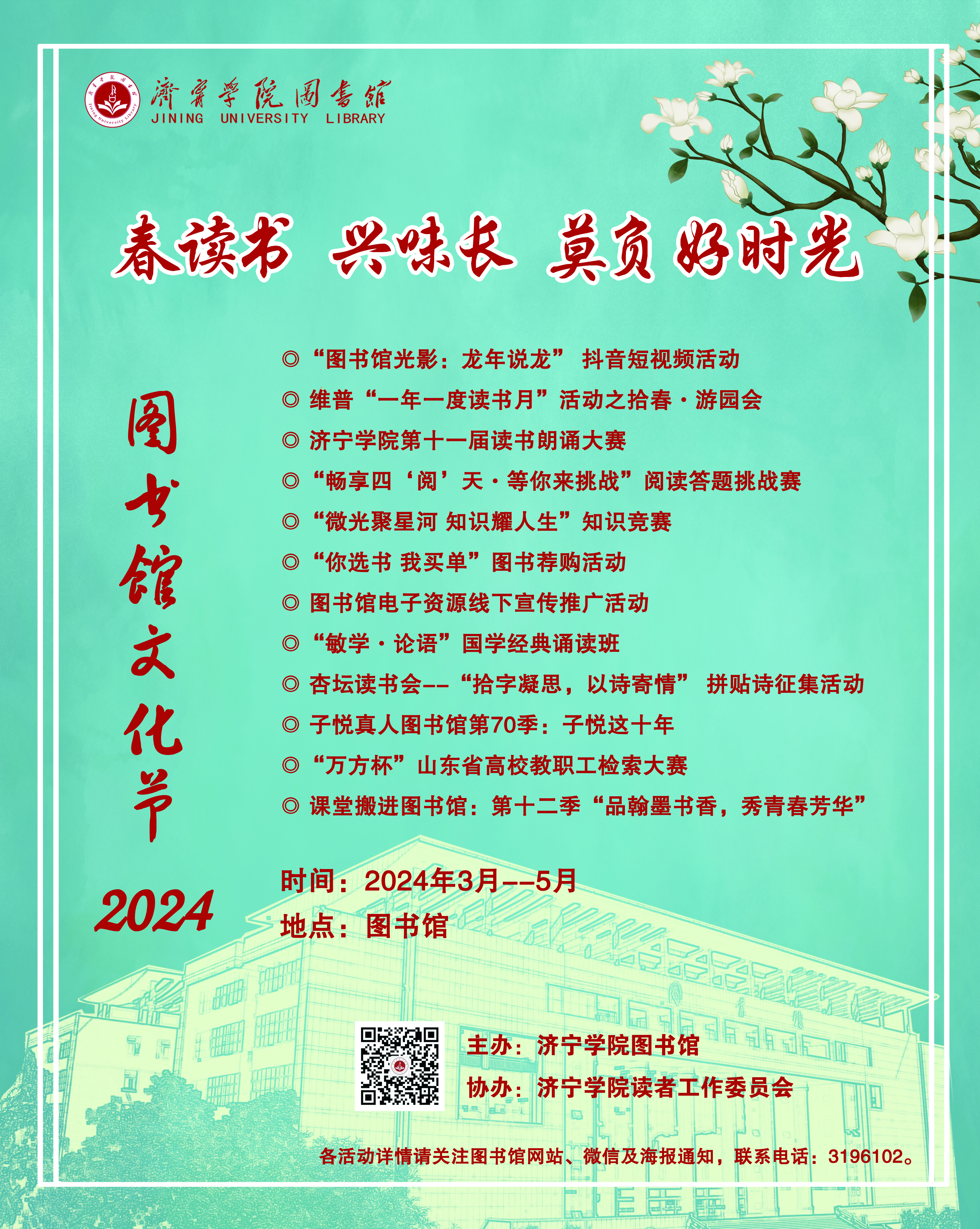 读书不觉已春深,一寸光阴一寸金。为推动深化全民阅读活动,营造书香文化氛围,在第29个世界读书日到来之际,自3月1日始,亚星在线登录官网图书馆举办“春读书 兴味长 莫负好时光”2024年图书馆文化节系列活动,为期2个月。将陆续推出“图书馆光影:龙年说龙” 抖音短视频活动、维普“一年一度读书月”活动之拾春·游园会、 “文脉传承·诵读中华”第十一届亚星在线登录官网读书朗诵大赛、“微光聚星河 知识耀人生”爱迪科森知识竞赛、“你选书,我买单”图书荐购活动、杏坛读书会--“拾字凝思,以诗寄情” 拼贴诗征集活动、“敏学·论语”国学经典诵读班等一系列活动,期冀通过丰富多彩的阅读文化活动,让更多的读者走进图书馆,共沐书香 ,赋能美好,欢迎每一位读者参与、体验、分享。