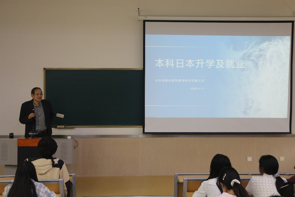 4月11日下午2:30,外国语学院在2号楼B201教室成功举办了一场主题为“大学生赴日本留学及就业”的宣讲会。此次活动特邀山东省财金康养教育科技有限公司的总经理王延平作为主讲嘉宾。财金康养副总经理王永军、郭平,外国语学院辅导员刘晓晖以及2021级选修大学日语的200余名学生参加了此次宣讲会。此次会议由外国语学院2021级商务英语专业学生刘力玮主持。