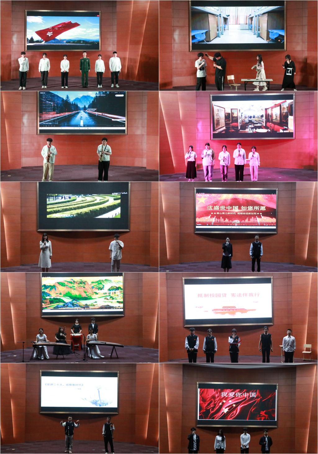 经过前期初选,共有13个节目入围本次决赛。13个节目主题鲜明——“1919、脱贫、马克思、中国、党的二十大、宪法”等一系列思政热词充分体现思政特色;13个节目形式多样——舞台剧、音乐剧、小品、歌唱、朗诵、快板、民乐合奏等青年学生喜闻乐见的精彩表演轮番登场。节目间隙,大成曲艺社赵金贵老师作为特邀嘉宾,为同学们带了一段精彩纷呈的山东快书——《闯红灯》,欢声笑语间,共建和谐社会的理念深入人心。