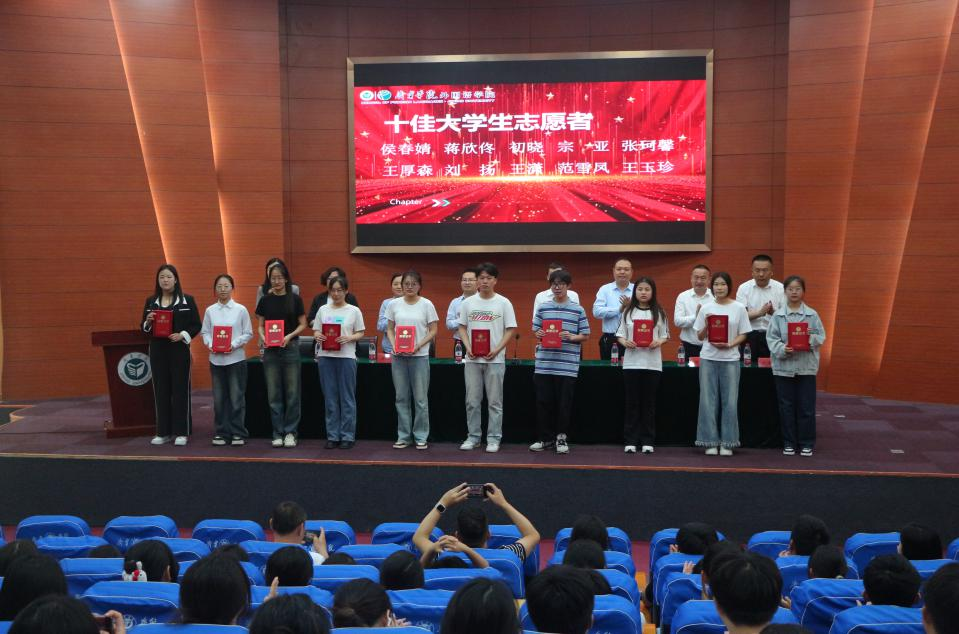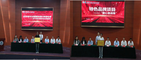 颁奖环节是对外国语学院志愿服务队辛勤工作的最佳肯定,庆典大会表彰了十佳大学生志愿者,并为志愿服务队颁发“优秀青年志愿服务团队”荣誉称号,为“爱心英语角”授予最佳特色品牌项目荣誉称号。