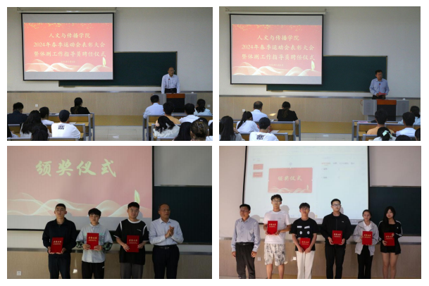 5月8日下午,人文与传播学院在2B102举办2024年度春季田径运动会总结表彰大会暨体测工作指导员聘任仪式。该院党委书记朱桂林、党委副书记岳现超、副院长李芬、各年级辅导员及全体运动员、运动会各工作组成员参加。大会由该院团委副书记张甜主持。