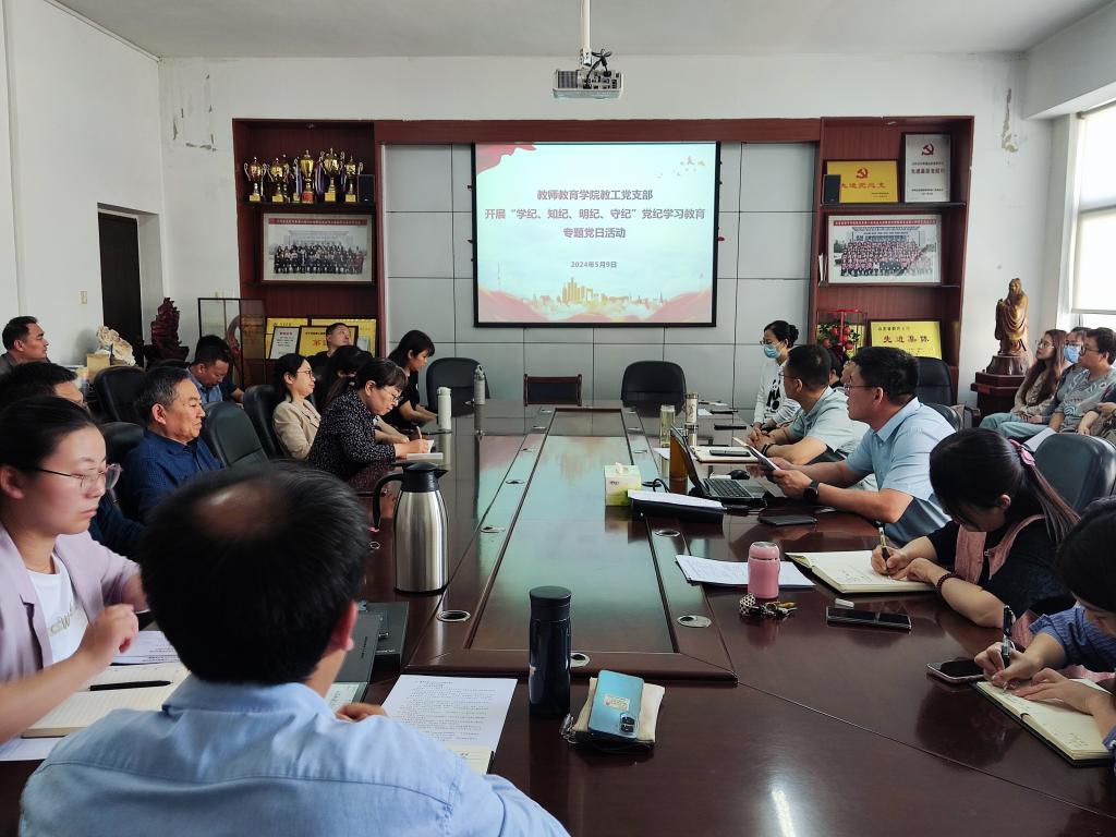 5月9日下午,教师教育学院教工党支部在2号楼A211党员活动室开展“学纪、知纪、明纪、守纪”党纪学习教育专题党日活动。会议由教工党支部组织委员袁金光主持。