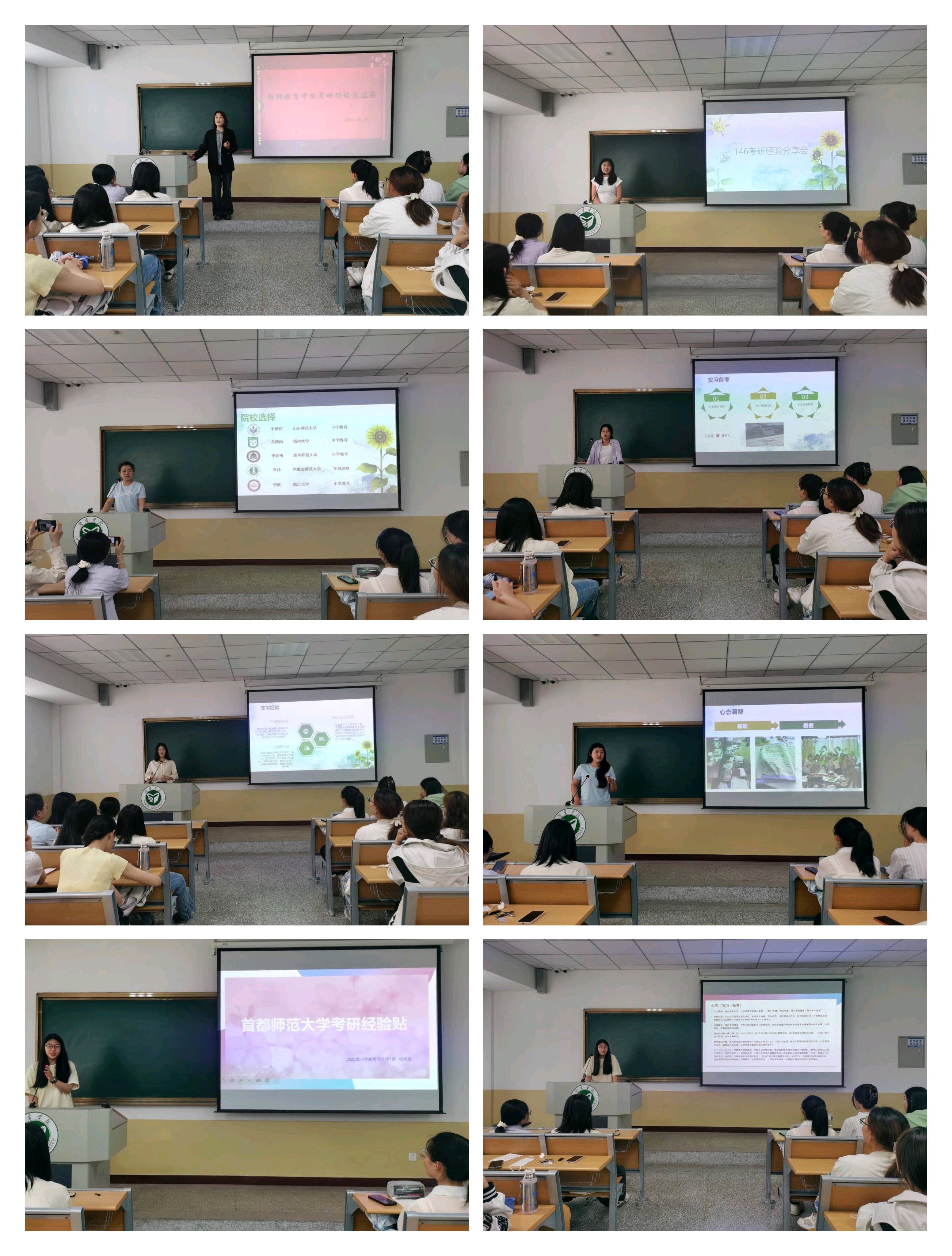 考研分享会上,考研宿舍4号楼146的李欣等同学一一进行经验分享,她们从宿舍考研氛围的营造到院校选择,实习支教期间备考和心态调整等方面进行了详细介绍;随后,成功上岸首都师范大学的杨晓童等考研代表分别结合自身学习过程中遇到的相关问题,从不同学科的角度介绍了各自的备考经验,并重点强调了实习支教期间合理分配各学科复习时间的规划问题。