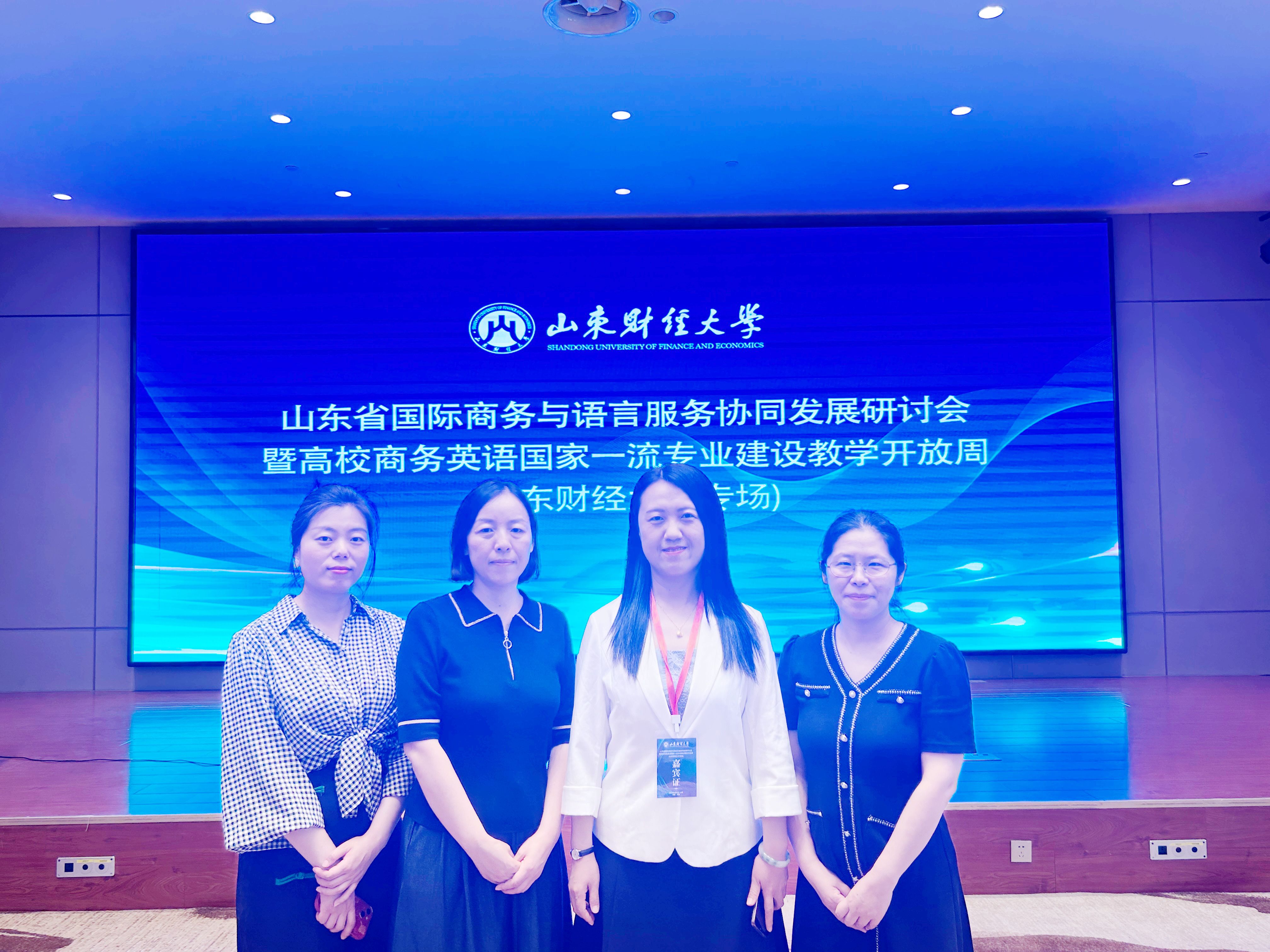 5月23日至26日,由山东财经大学与中国对外贸易经济合作企业协会国际商业与语言服务专业委员会联合主办的“山东省国际商务与语言服务协同发展研讨会暨高校商务英语国家一流专业建设教学开放周”在山东财经大学举办。来自全国48所高校的120多名专家学者齐聚一堂,共同探讨国际商务与语言服务领域的最新动态和发展趋势。外国语学院副院长张颖、院长助理刘暖、商务英语教研室主任李霄露、专业教师杨海芳参加了此次会议。会上举行了山东省国际商务与语言服务专家指导委员会成立仪式,张颖获聘副主任委员,闫彩霞和李霄露分别担任常务理事和理事。
