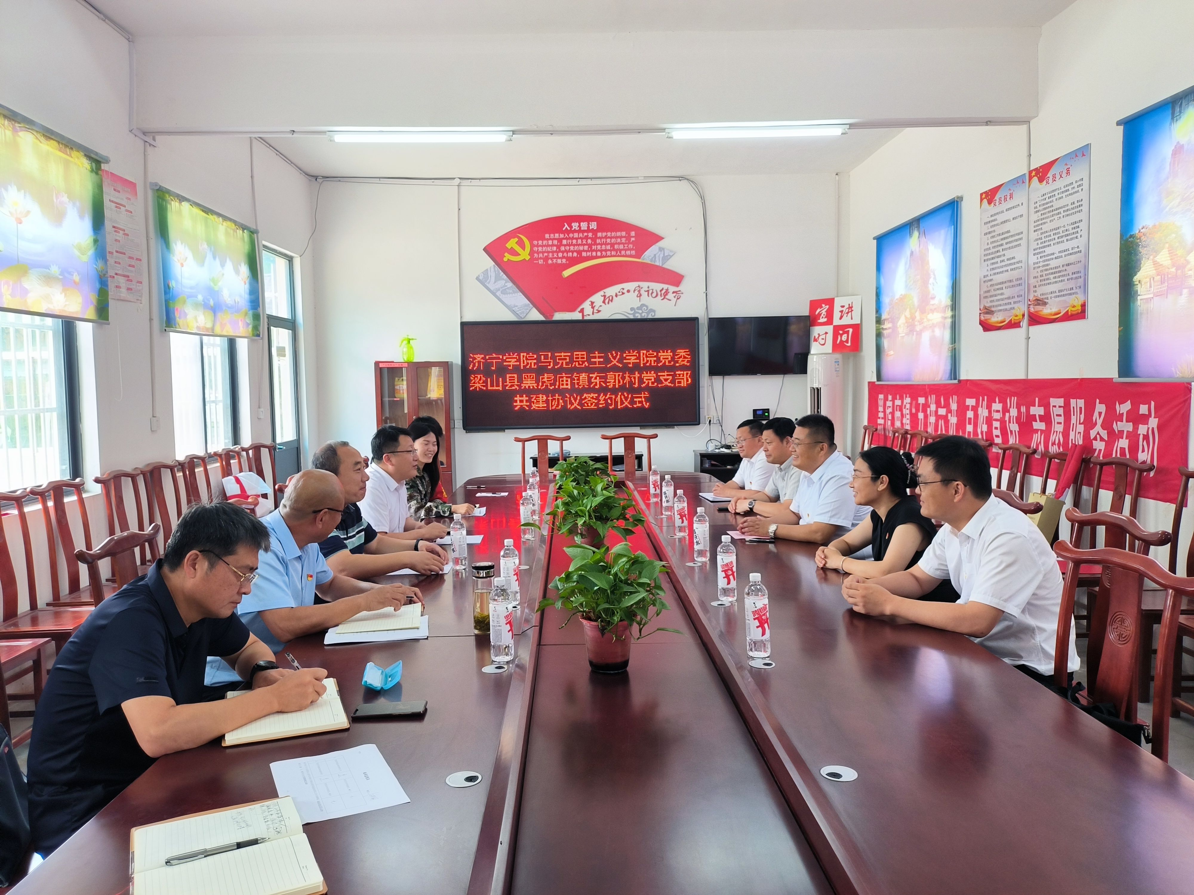 为全面贯彻落实新时代党的建设总要求,探索基层党建工作新思路、新模式,以党建引领促进乡村振兴,6月5日下午,马克思主义学院党委书记李效民一行5人,赴“第一书记”帮扶村梁山县黑虎庙镇东郭村,举行支部共建协议签约暨授牌仪式。黑虎庙镇党委书记赵忠跃、组织委员樊艳青,东郭村两委班子成员及亚星在线登录官网4名省派第一书记,马克思主义学院领导班子成员及教工党支部、学生党支部书记参加。
