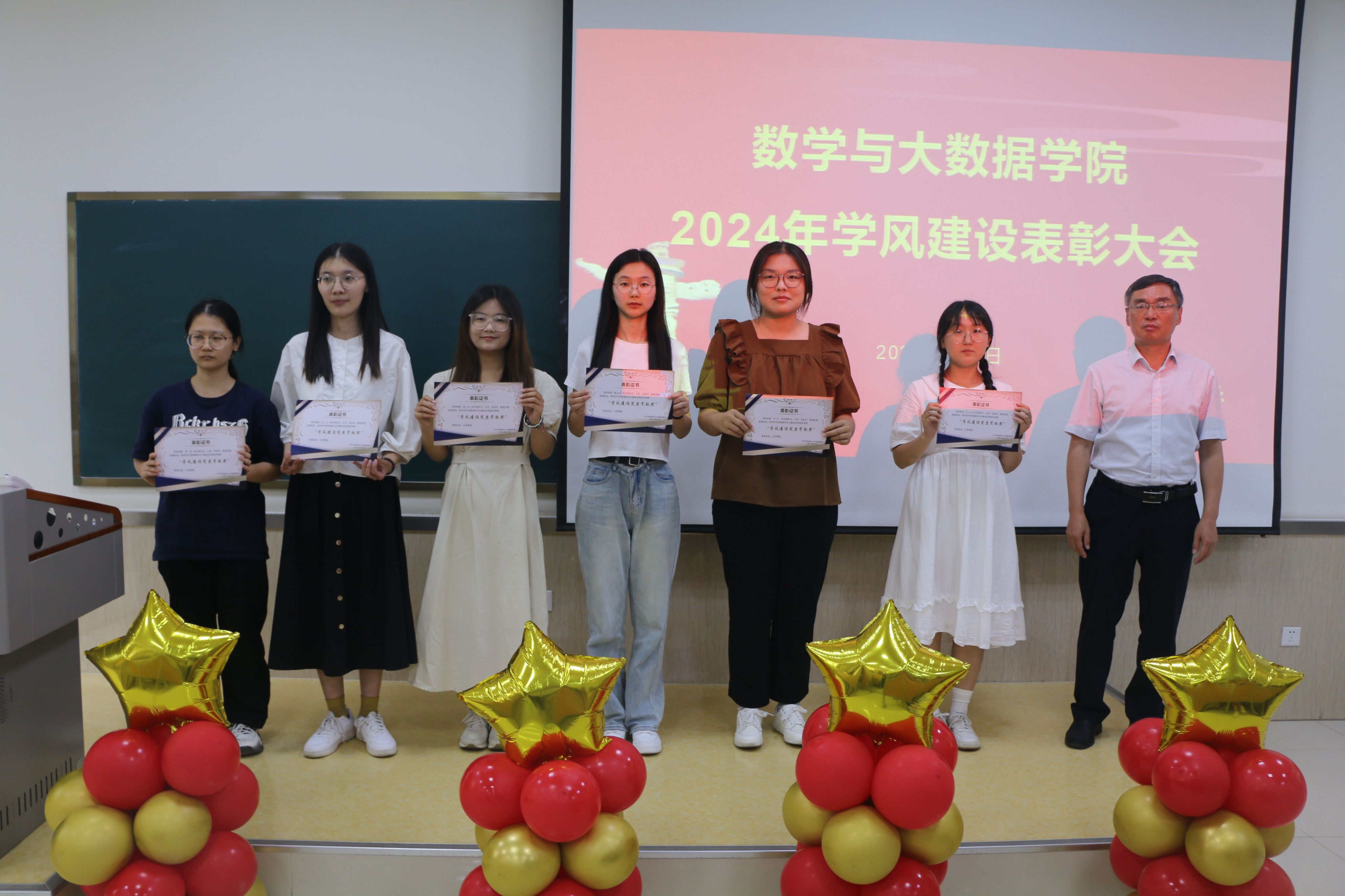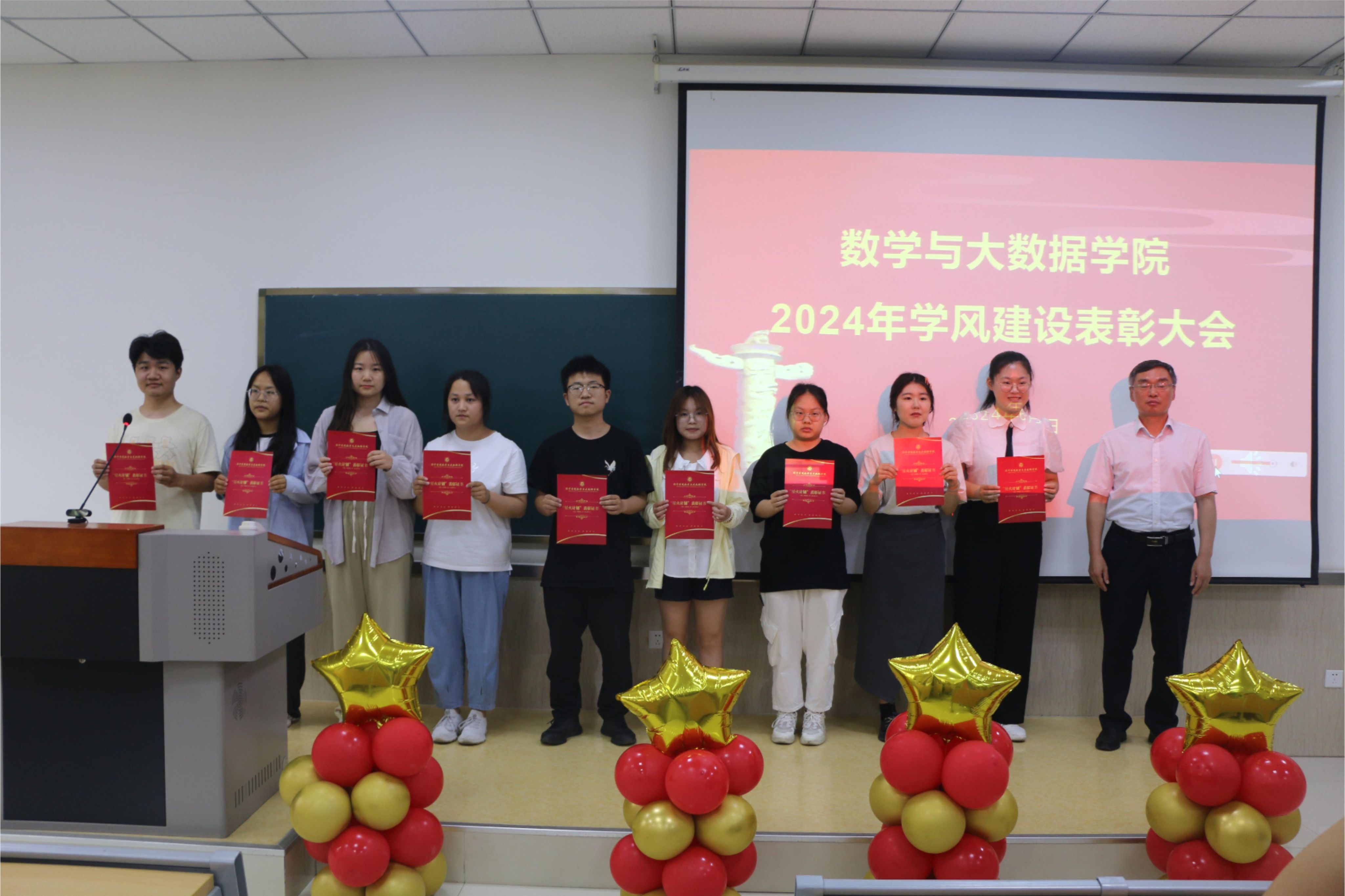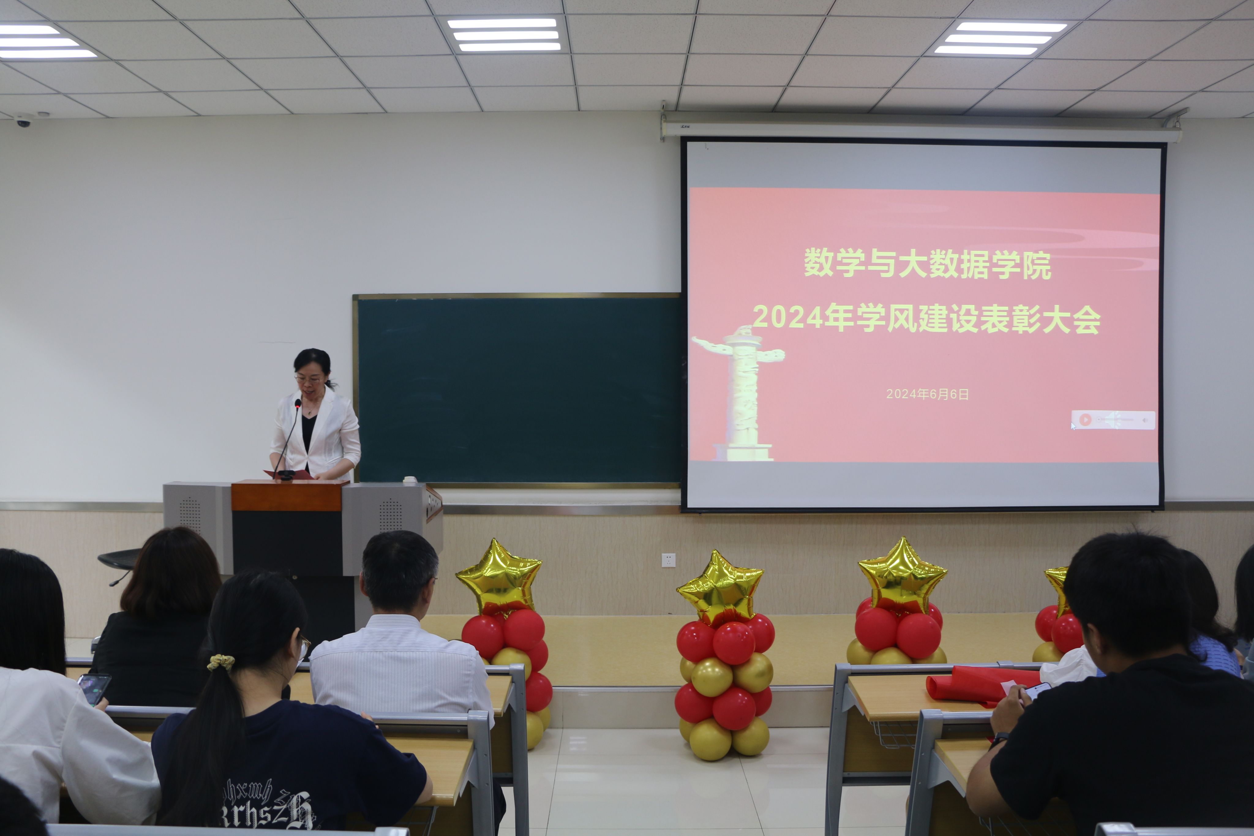 为总结过去一年的学风建设工作,部署下一步学风建设重点任务,动员全院师生凝心聚力推动人才培养更上新台阶,数学与大数据学院积极响应学校号召,于6月6日下午在8号楼B203教室召开学风建设表彰大会。学院党委书记孙文,副院长黄长虹、马小翠、学术副院长申莹,院长助理王江峰,及部分教师代表、辅导员代表出席。来自不同年级的近二百名同学参加。会议由团委副书记陈轶洋主持。