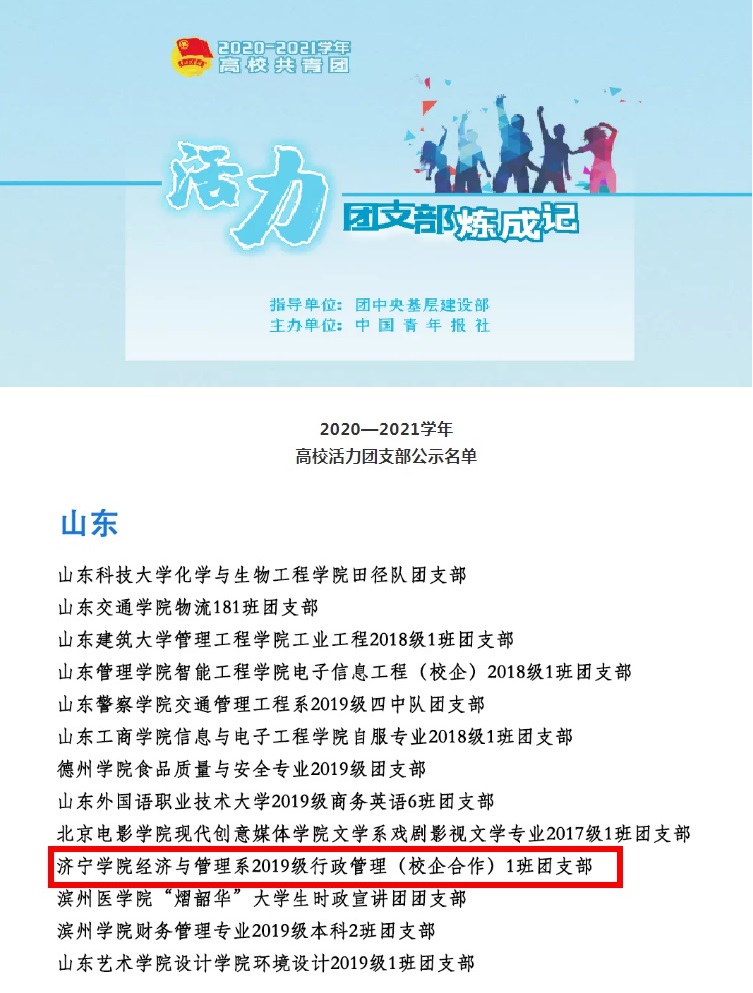 日前,由团中央基层建设部指导、中国青年报社主办的“活力团支部炼成记”2020—2021学年高校活力团支部遴选活动结果已揭晓。山东省共有66个团支部获此荣誉,我校儒商学院2019级行政管理(校企合作)1班团支部喜获“全国高校活力团支部”称号。