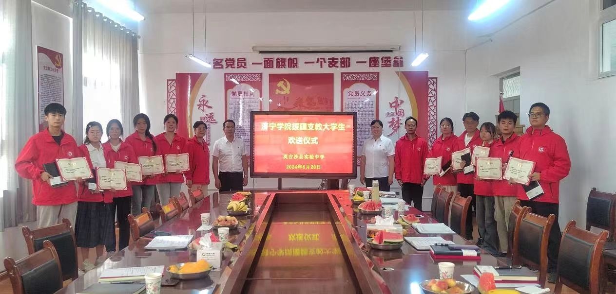 6月29日,济英中学为支教团同学召开欢送会。济英中学汪小龙书记、狄东亮校长等出席会议。汪小龙祝贺支教团同学圆满完成了援疆实习支教任务,肯定支教团同学为济英中学做出的贡献,并向支教团同学表达了诚挚的感谢。他为支教团同学颁发荣誉证书,支教团同学深受鼓舞,心中充满无尽的温暖和感动。