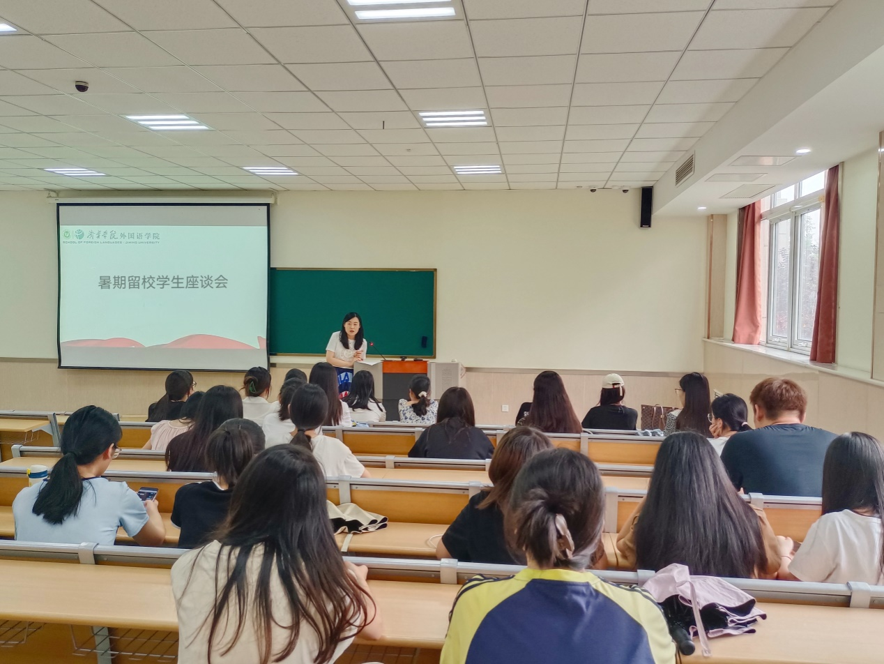 为扎实做好2024年暑期留校学生工作,规范留校学生教育和管理,强化学生安全意识,共同营造安全健康、积极和谐的校园环境,7月5日上午,外国语学院在3C201召开暑期留校学生座谈会,外国语学院党委副书记文灿、辅导员田清敏和段明月以及暑期留校学生参加会议,会议以线上线下结合的方式进行。