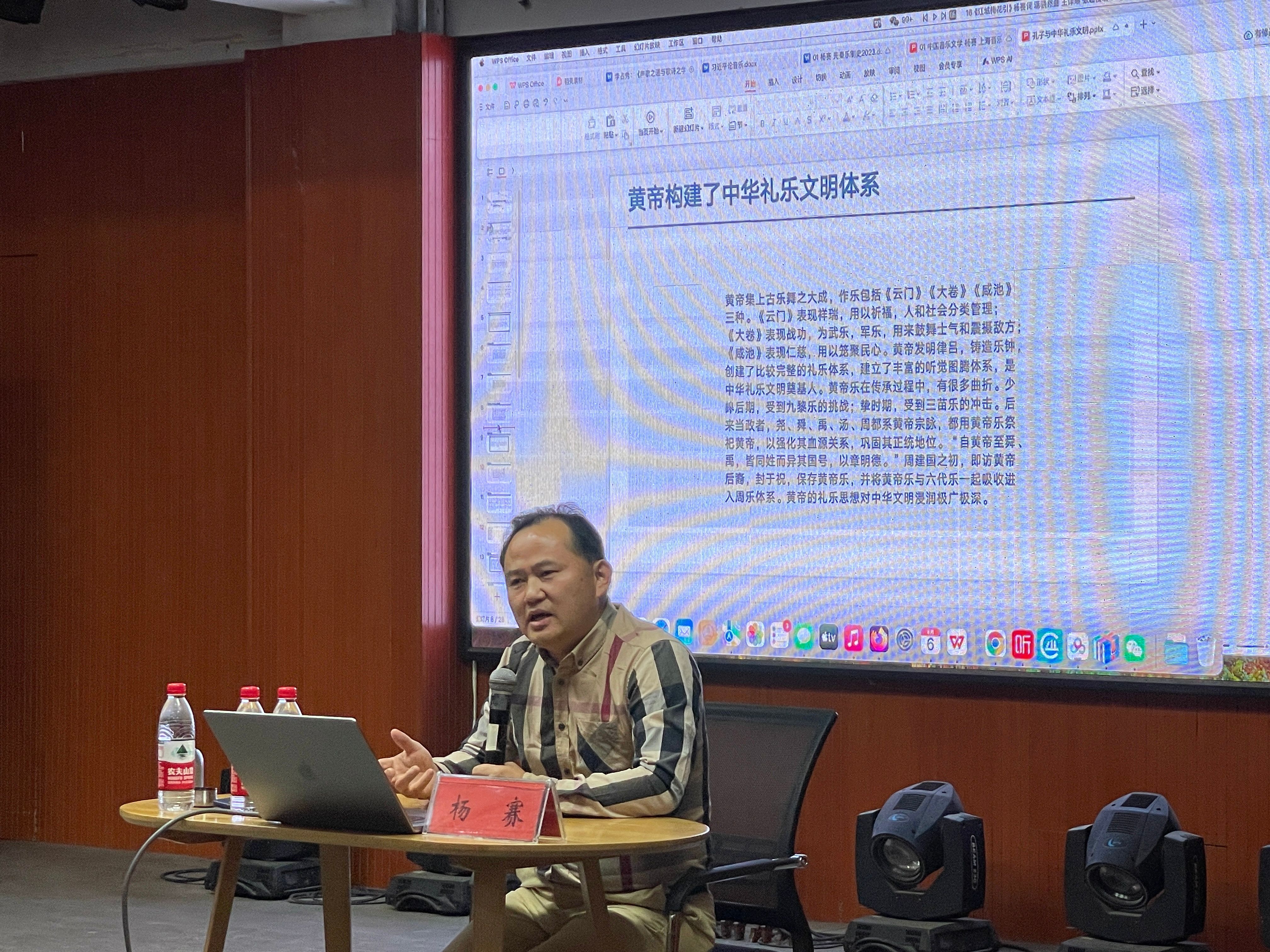 讲座上,杨赛以《孔子与中华礼乐文明》为题,以中华礼乐文明的历史渊源为引入,阐述了礼乐的内涵和形式以及中华传统礼乐的发展历程。他表示,中华礼乐文明是新时代中国式现代化精神文明建设的重要资源,曲阜作为构建中华文明标识体系的重要组成部分,要在传统礼乐领域的研究和传承上发挥更大的作用。