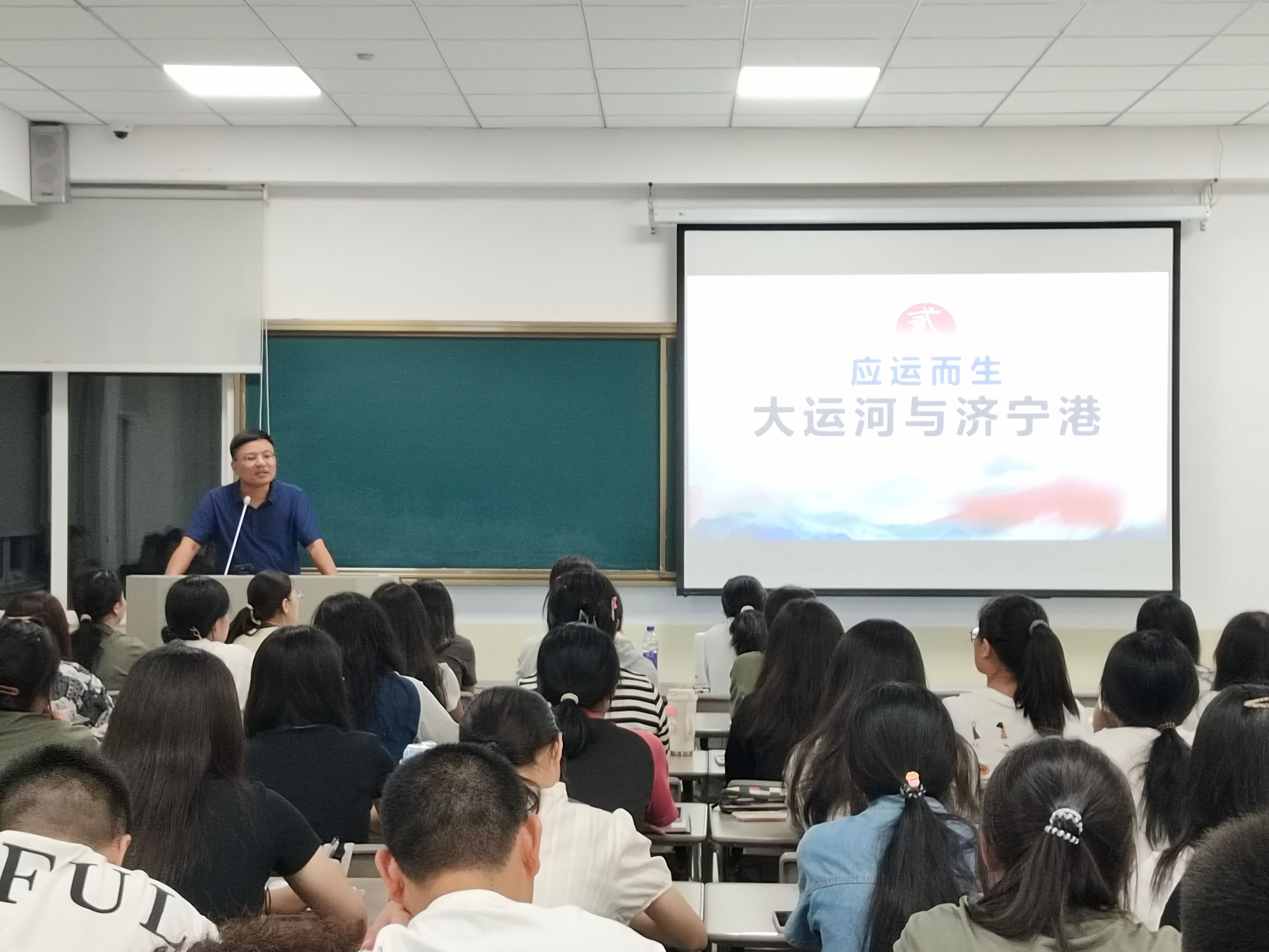 赵青围绕古运河与济宁城、大运河与济宁港、今运河与新青年、新精神与新使命四个方面展开。通过生动的历史故事与案例分析,阐述了运河文化中蕴含的勤劳智慧、开放包容的精神特质,强调这些精神与马克思主义理论中的实践观、发展观相契合,是新时代青年学子应当继承和发扬的宝贵财富。赵青特别指出,作为马克思主义学院的新生,同学们应当立足于中国实际,将马克思主义基本原理同中国优秀传统文化相结合,特别是在运河文化这一独特视角下,探索如何在新的历史条件下创新发展马克思主义理论,为实现中华民族伟大复兴的中国梦贡献力量。