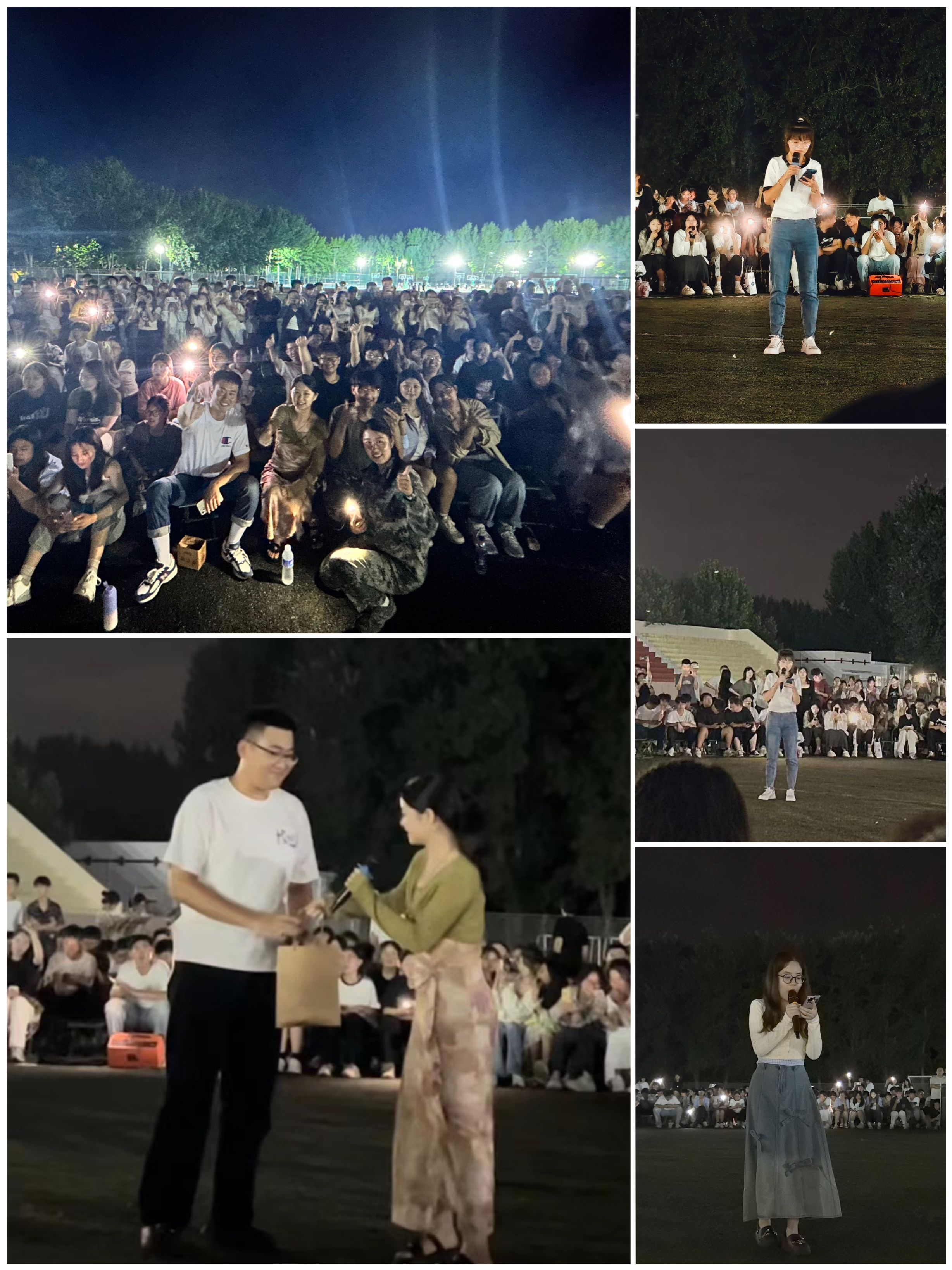 新生辅导员付茹雪为中秋期间过生日的新生送上了温馨的祝福和精美的礼物,让新生倍感惊喜与感动,也为这个夜晚增添了几分特别的意义。在异乡的军训生活中,但愿这份来自师长的关怀,能够驱散新生初次离家的孤单。夜深了,同学们的中秋庆祝活动并未因此而降温。一轮明月下,同学们打开闪光灯一同合唱,灯火阑珊处,每一点光芒都是对未来的期许,对知识的渴望,对文化的尊重,以及对马克思主义信仰的坚定。