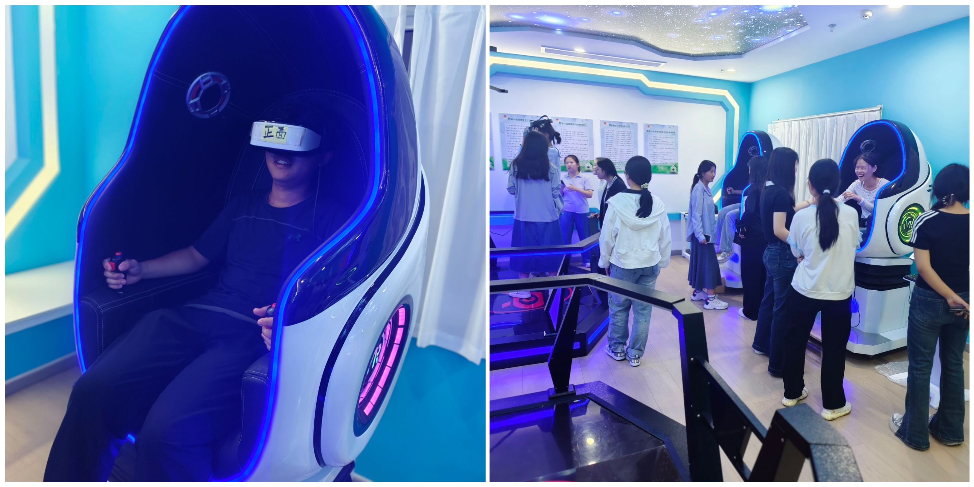 在心理健康中心,同学们首先体验了充满科技感的VR 设备。通过VR技术,同学们仿佛置身于不同的场景中,沉浸式地感受各种情绪和情境,疏导个人情绪,对心理健康有了更直观的认识。