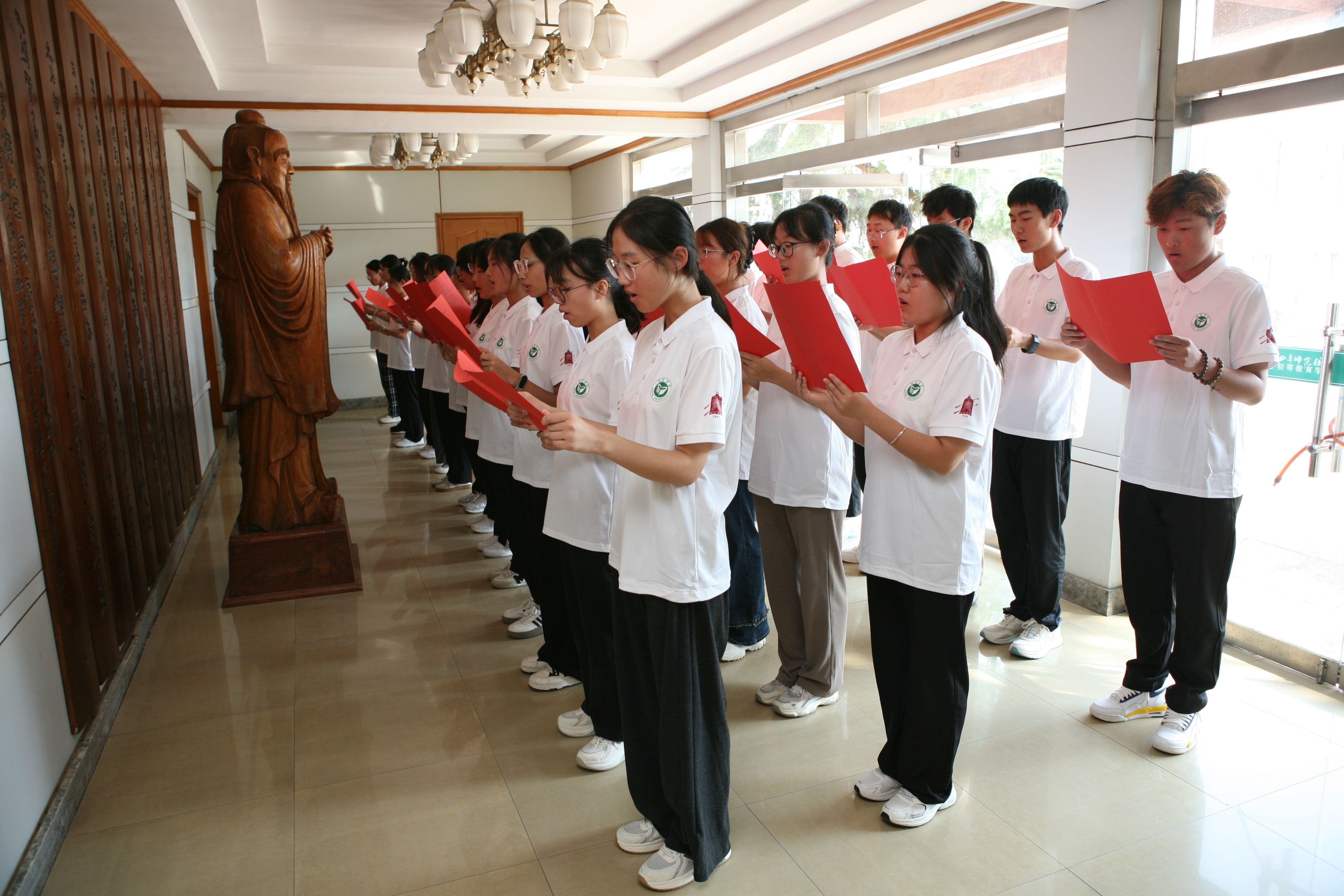 端身正立、肃整衣冠,2024级新生怀着崇敬之情向孔子像行鞠躬礼。拜师礼后,同学们齐声诵读《论语》,恭敬诵读中华传统经典,以传承中华民族传统文化血脉,推崇尊师重教传统,刻苦学习,开创未来。