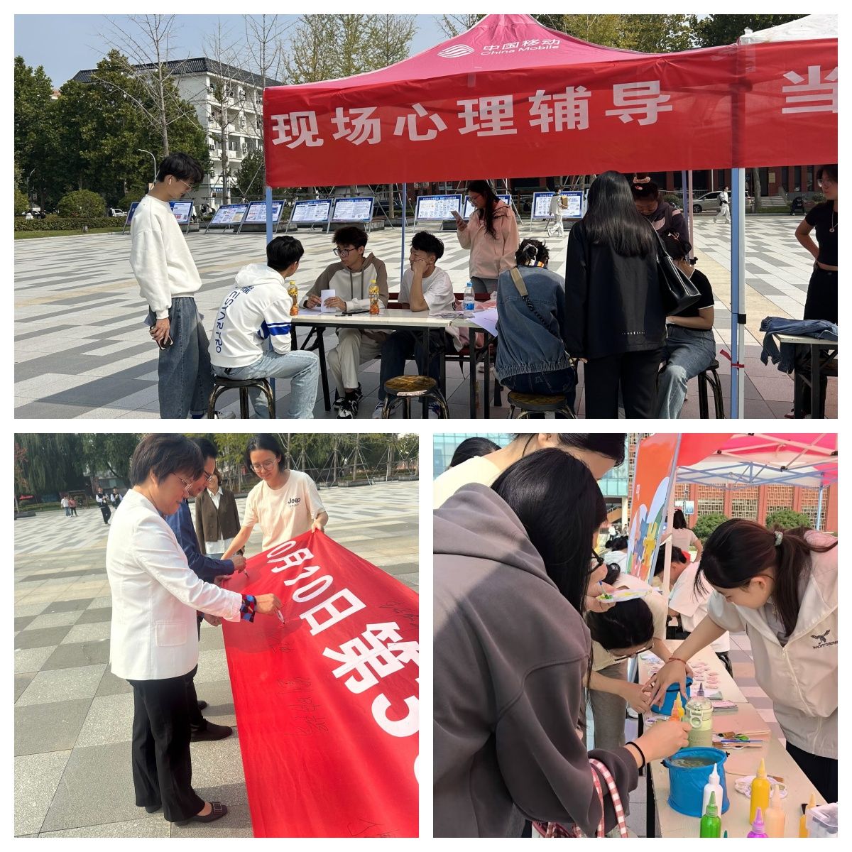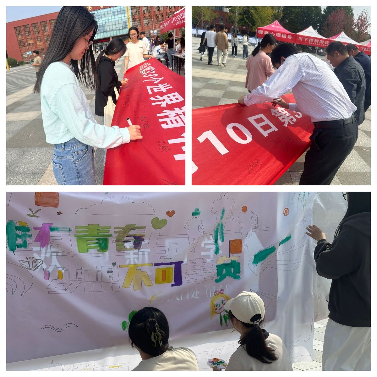本次活动以第33个世界精神卫生日为契机,践行五育并举促进心理健康的理念,通过寓教于乐的方式,向广大师生宣传心理健康知识。签名活动现场,师生们参与热情高涨,纷纷驻足郑重地在横幅上签下自己的名字,以表示对于心理健康的重视和对“我是心理健康第一责任人”的承诺;“共‘画’未来”活动,通过接力绘画、涂鸦的方式,共绘青春“蓝图”,释放青春正能量;现场朋辈心理辅导活动让同学们在倾诉烦恼的过程中,汲取朋辈心理互助的温暖;现场还通过发放心理健康知识宣传册、卡片、小礼品的形式向同学们科普心理健康知识。