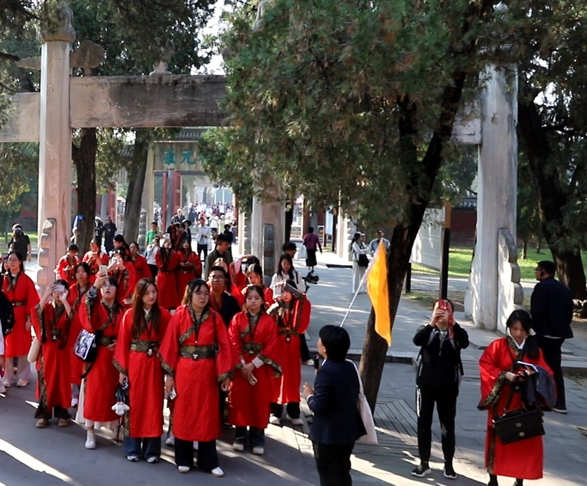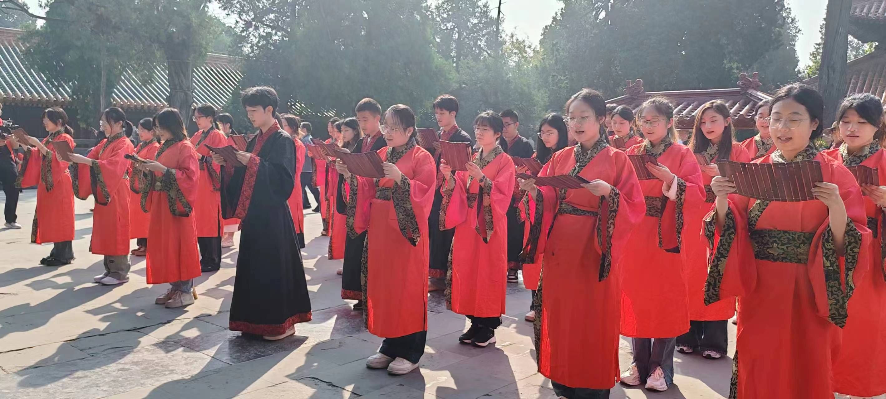 上午,参赛学生身着汉服,在导游的带领下,先后参观了孔庙、孔府。在孔庙,师生们观看祭孔仪式,沉浸式体验儒家文化中“礼”的庄重与深远意义;同学们齐诵《论语》经典篇章,在声声诵读中深化对儒学经典的理解,表达对先师的敬仰之情。在孔府,参赛师生从孔氏家族的家风、家规、家训中领悟儒家文化的精髓和核心价值。